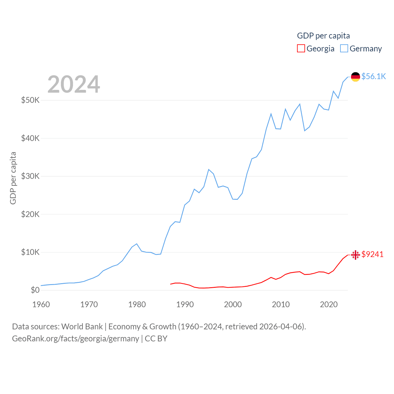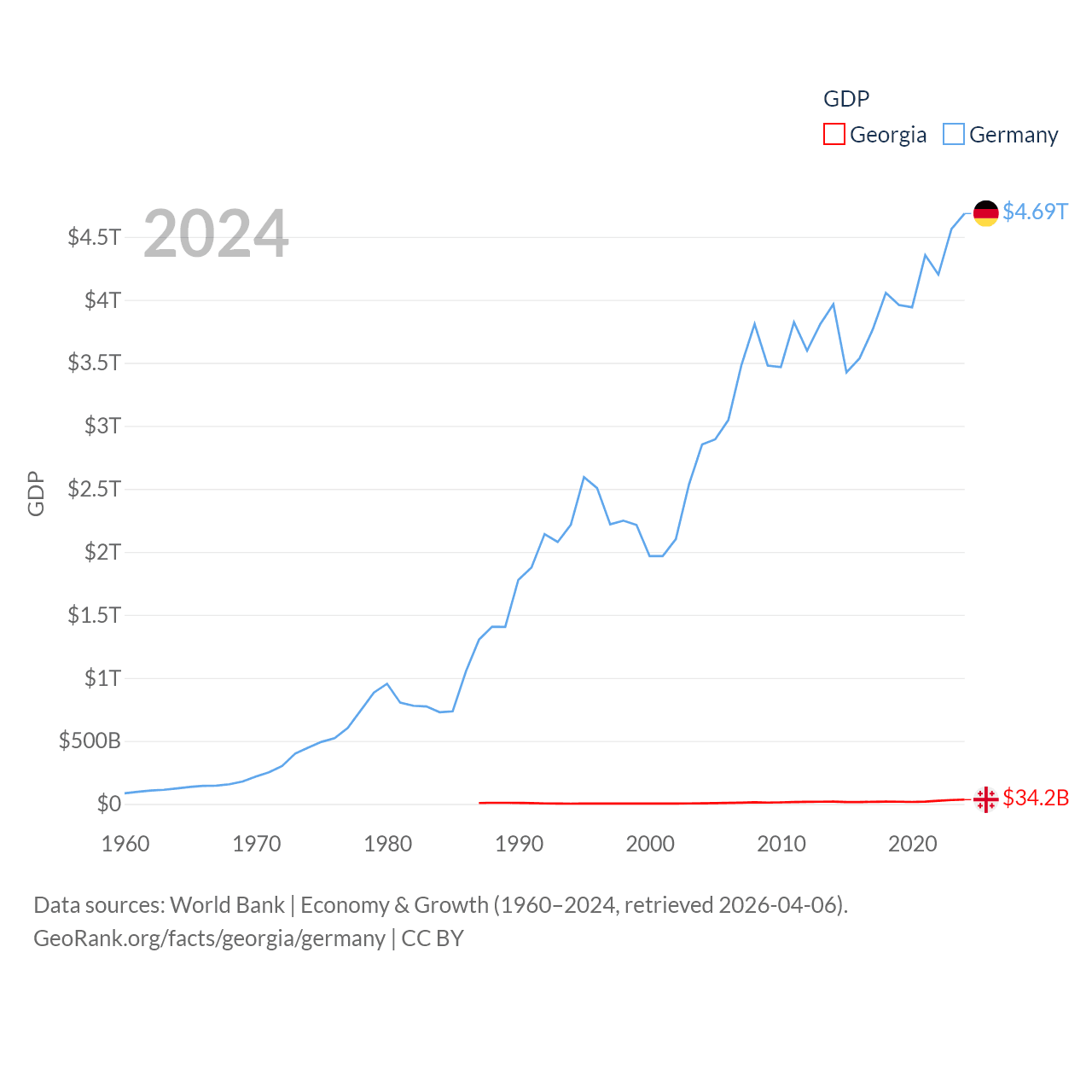 By GDP, Georgia ranks 107/197 ($34.2B) and Germany ranks 3/197 ($4.69T). By GDP per capita, Georgia ranks 89/197 ($9,241), while Germany ranks 19/197 ($56,104).