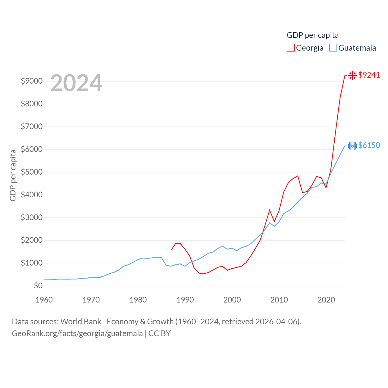 By GDP, Georgia ranks 107/197 ($34.2B) and Guatemala ranks 68/197 ($113B). By GDP per capita, Georgia ranks 89/197 ($9,241), while Guatemala ranks 112/197 ($6,150).