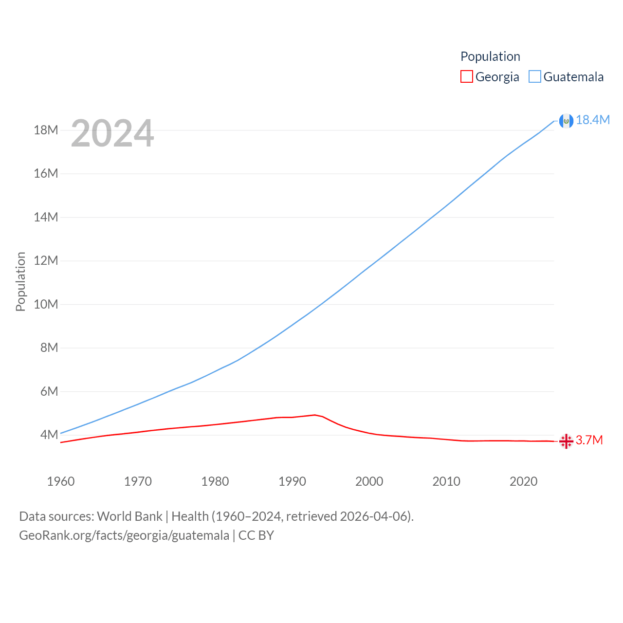 Georgia has a population of 3.7M (ranked 130/197), compared with 18.4M in Guatemala (ranked 70/197). Georgia's land area is 26,830 sq mi versus 41,375 sq mi for Guatemala (ranked 118th vs. 102nd).