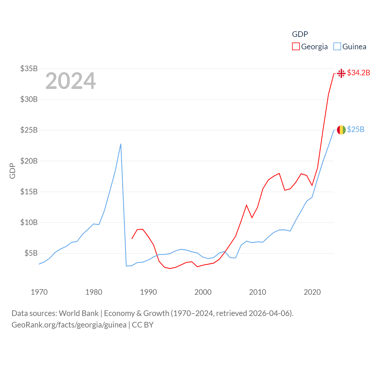 By GDP, Georgia ranks 107/197 ($34.2B) and Guinea ranks 118/197 ($25B). By GDP per capita, Georgia ranks 89/197 ($9,241), while Guinea ranks 160/197 ($1,695).