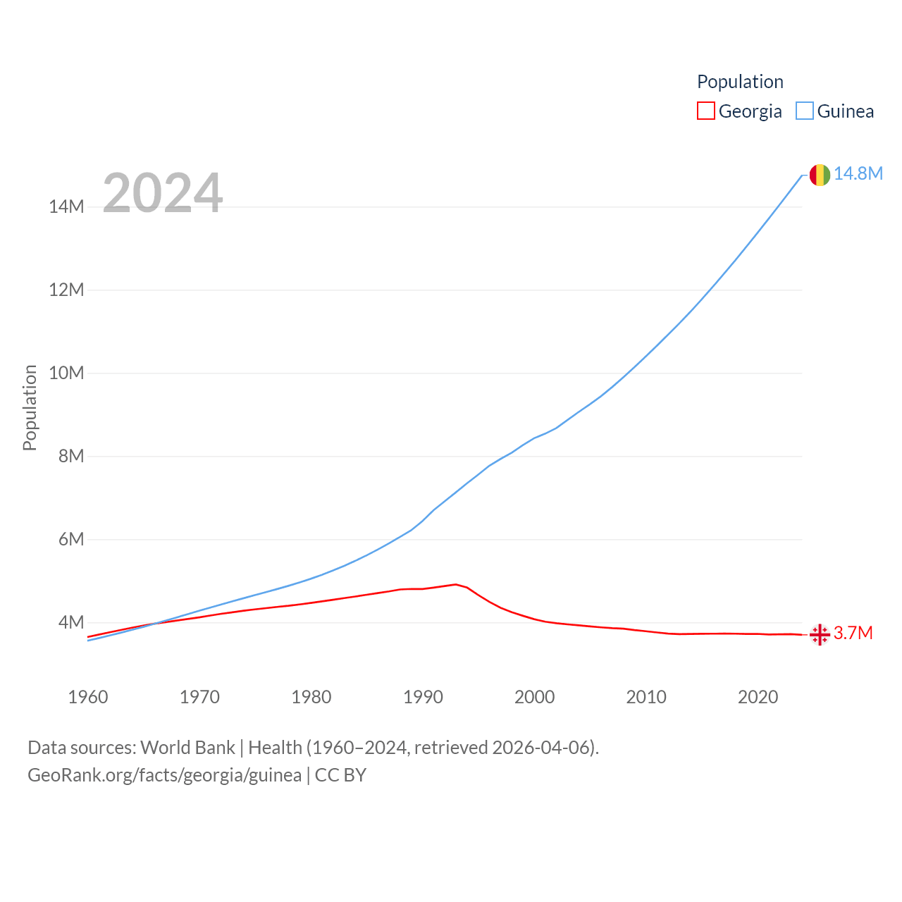 Georgia has a population of 3.7M (ranked 130/197), compared with 14.8M in Guinea (ranked 75/197). Georgia's land area is 26,830 sq mi versus 94,873 sq mi for Guinea (ranked 118th vs. 77th).