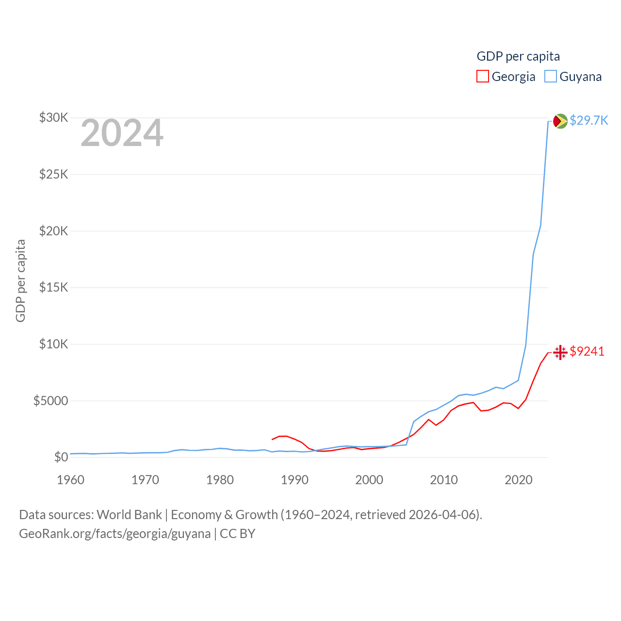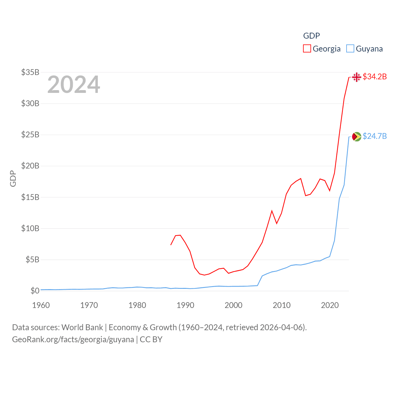 By GDP, Georgia ranks 107/197 ($34.2B) and Guyana ranks 120/197 ($24.7B). By GDP per capita, Georgia ranks 89/197 ($9,241), while Guyana ranks 41/197 ($29,675).