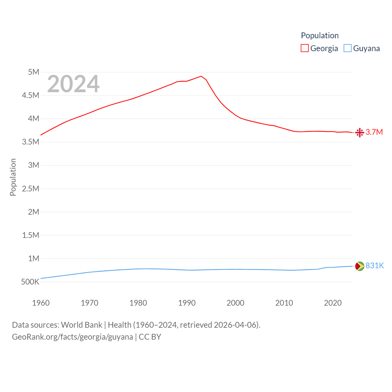 Georgia has a population of 3.7M (ranked 130/197), compared with 831K in Guyana (ranked 161/197). Georgia's land area is 26,830 sq mi versus 81,522 sq mi for Guyana (ranked 118th vs. 82nd).