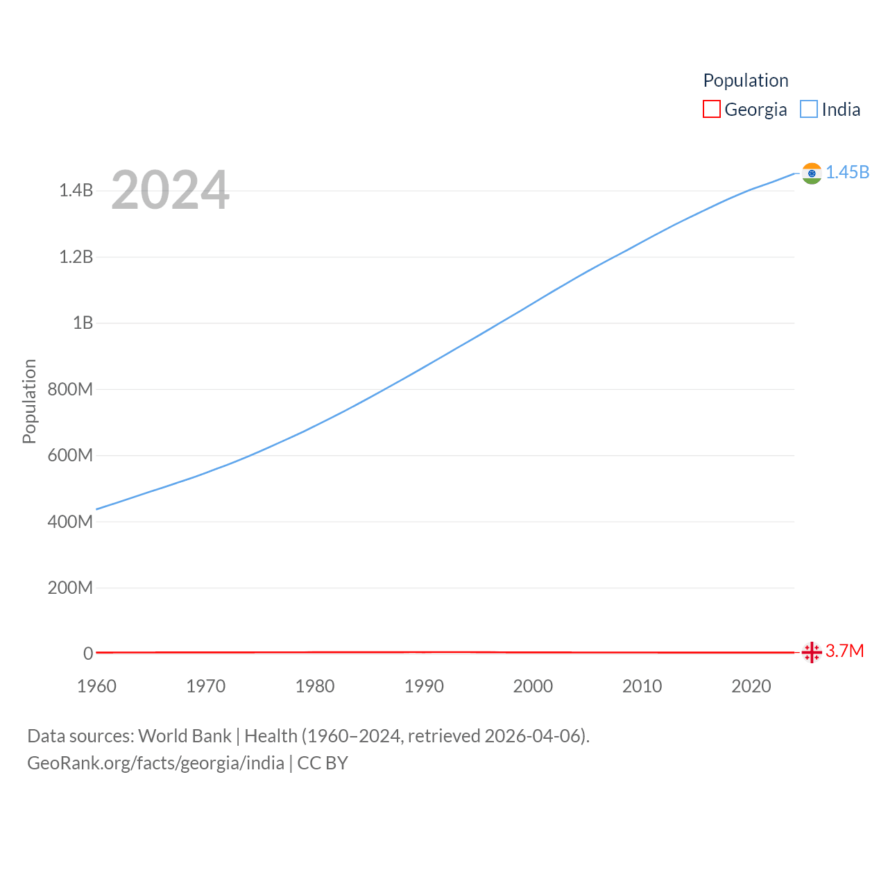 Georgia has a population of 3.7M (ranked 130/197), compared with 1.45B in India (ranked 1/197). Georgia's land area is 26,830 sq mi versus 1,147,955 sq mi for India (ranked 118th vs. 7th).