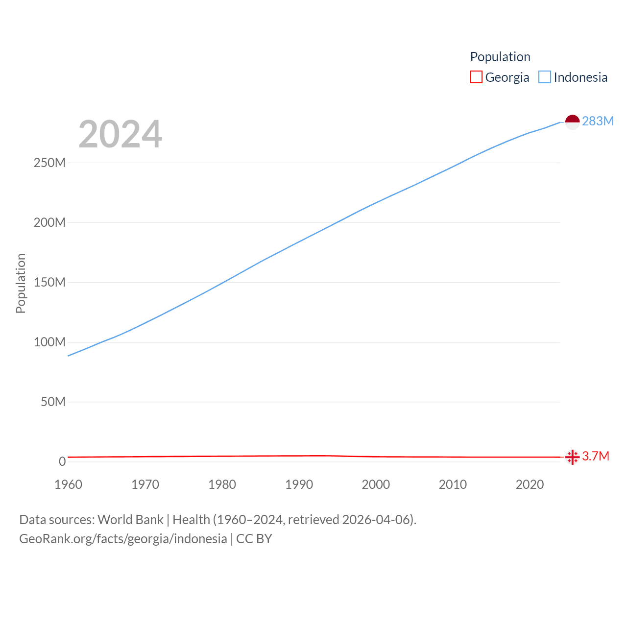 Georgia has a population of 3.7M (ranked 130/197), compared with 283M in Indonesia (ranked 4/197). Georgia's land area is 26,830 sq mi versus 730,720 sq mi for Indonesia (ranked 118th vs. 14th).