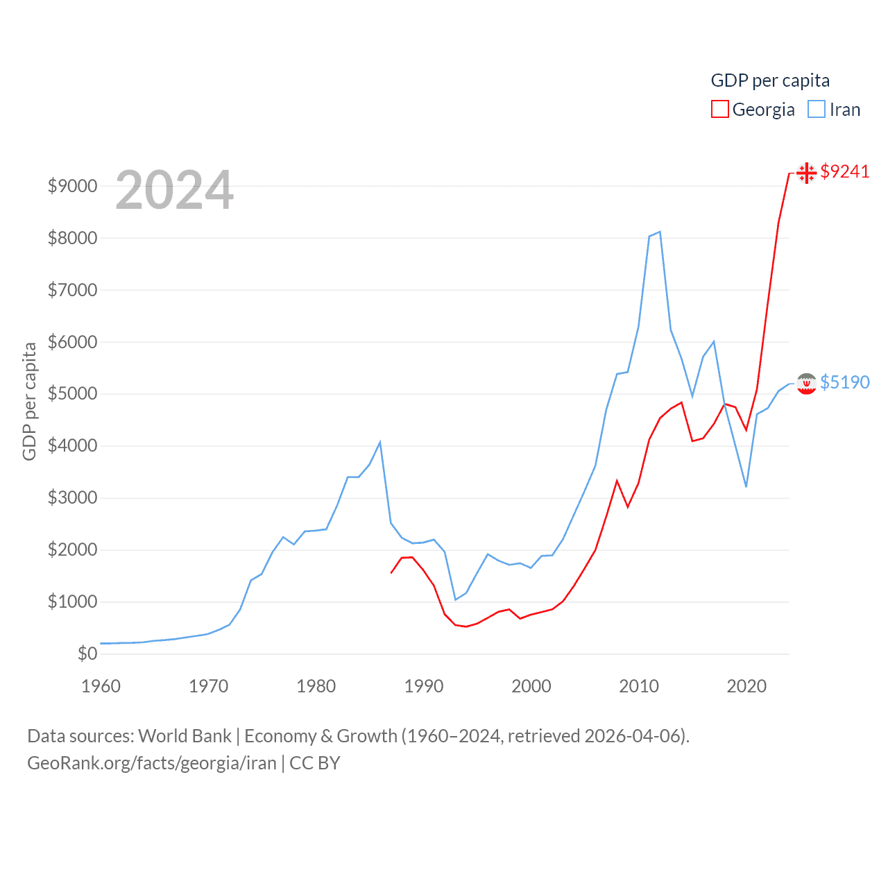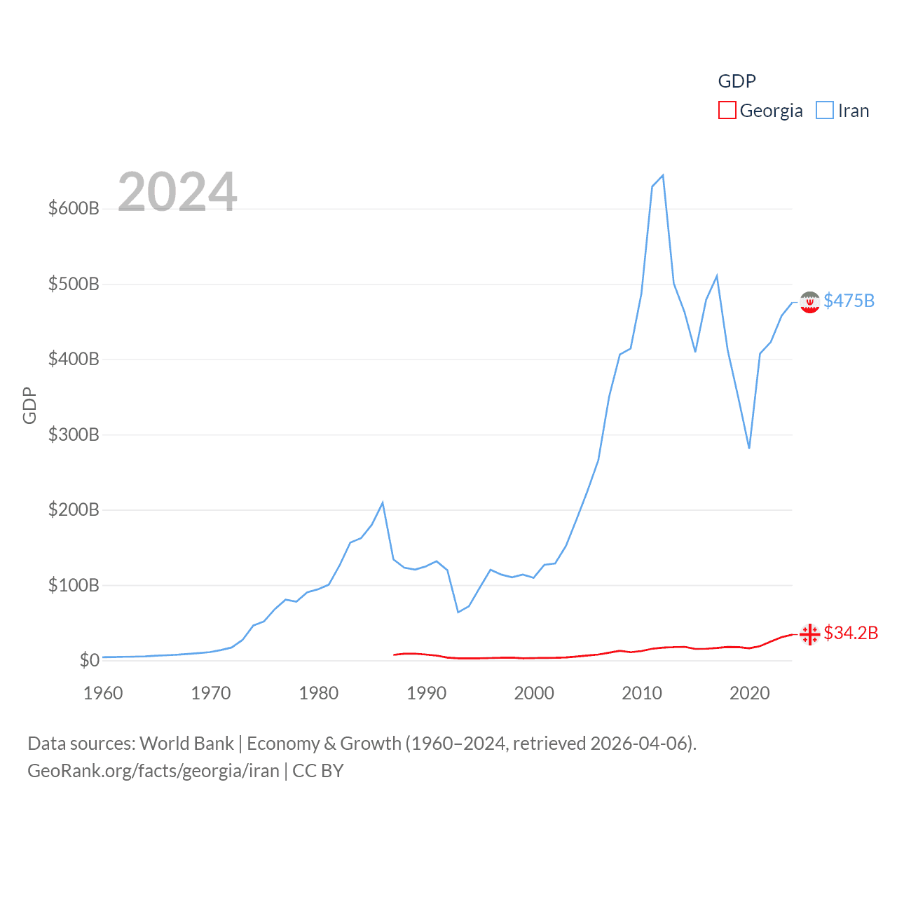 By GDP, Georgia ranks 107/197 ($34.2B) and Iran ranks 34/197 ($475B). By GDP per capita, Georgia ranks 89/197 ($9,241), while Iran ranks 119/197 ($5,190).