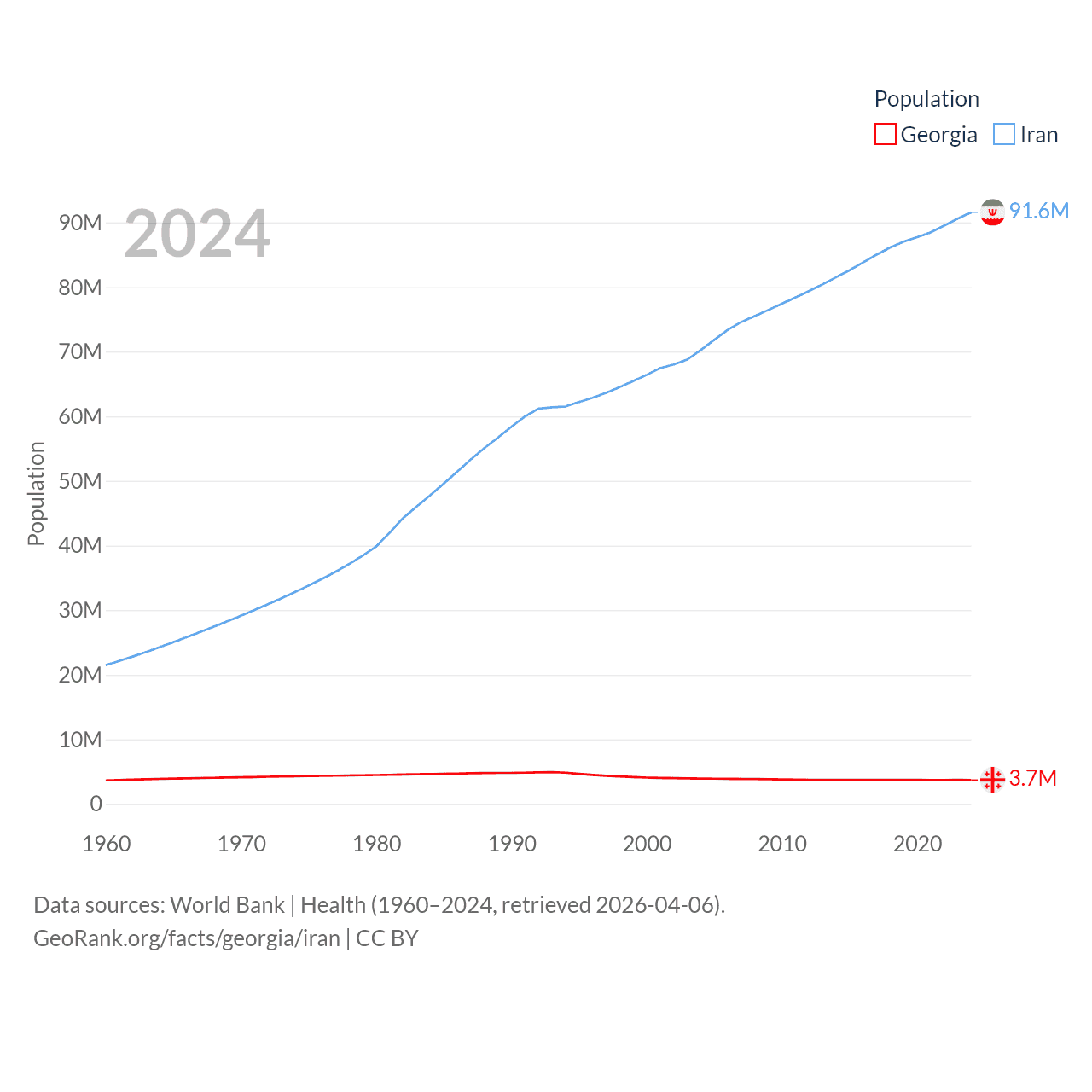 Georgia has a population of 3.7M (ranked 130/197), compared with 91.6M in Iran (ranked 17/197). Georgia's land area is 26,830 sq mi versus 626,451 sq mi for Iran (ranked 118th vs. 17th).