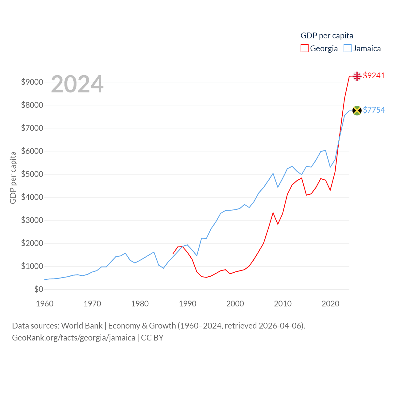 By GDP, Georgia ranks 107/197 ($34.2B) and Jamaica ranks 124/197 ($22B). By GDP per capita, Georgia ranks 89/197 ($9,241), while Jamaica ranks 95/197 ($7,754).