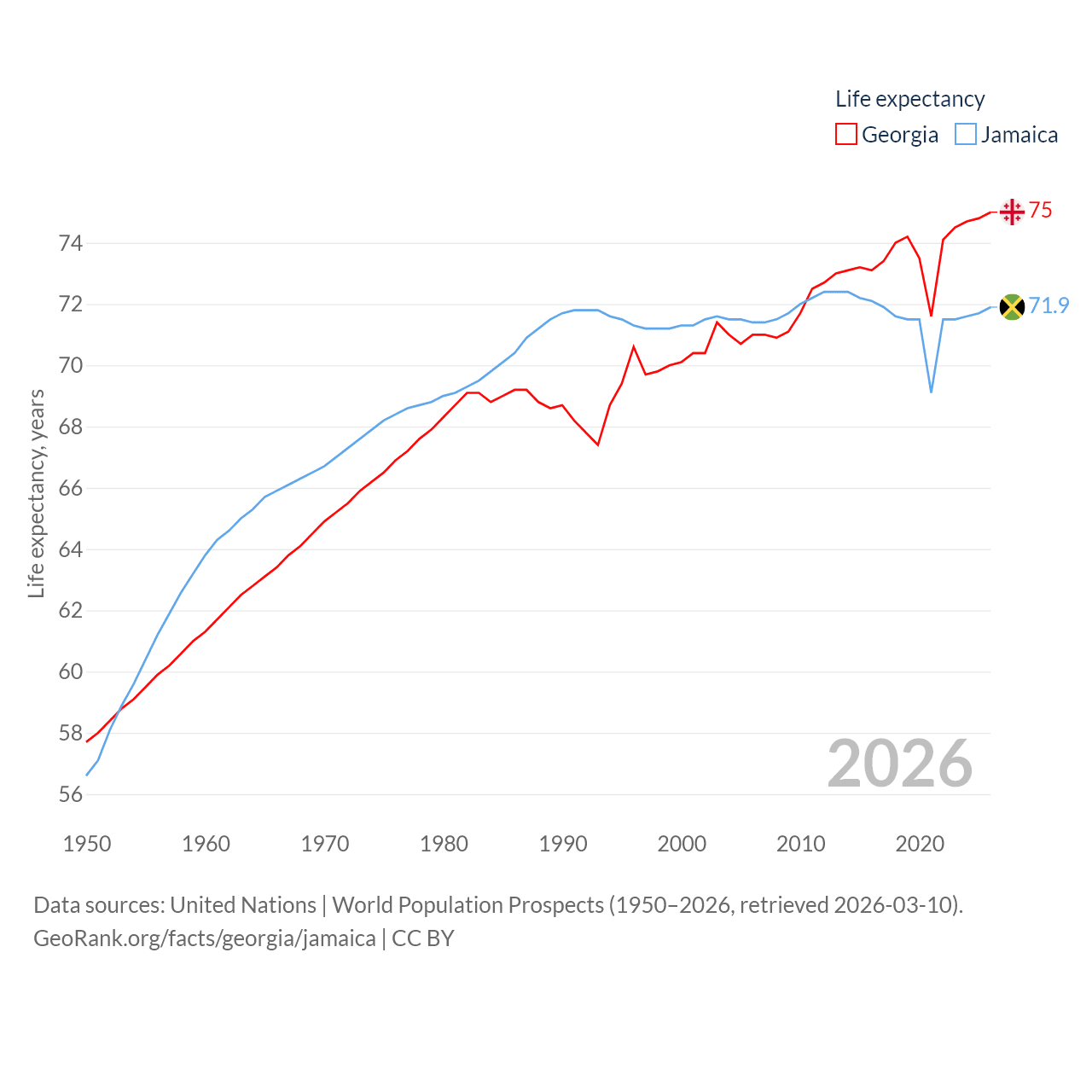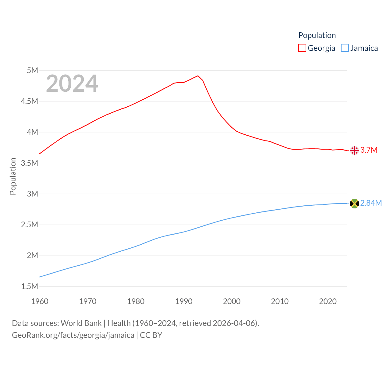 Georgia has a population of 3.7M (ranked 130/197), compared with 2.84M in Jamaica (ranked 139/197). Georgia's land area is 26,830 sq mi versus 4,181 sq mi for Jamaica (ranked 118th vs. 159th).