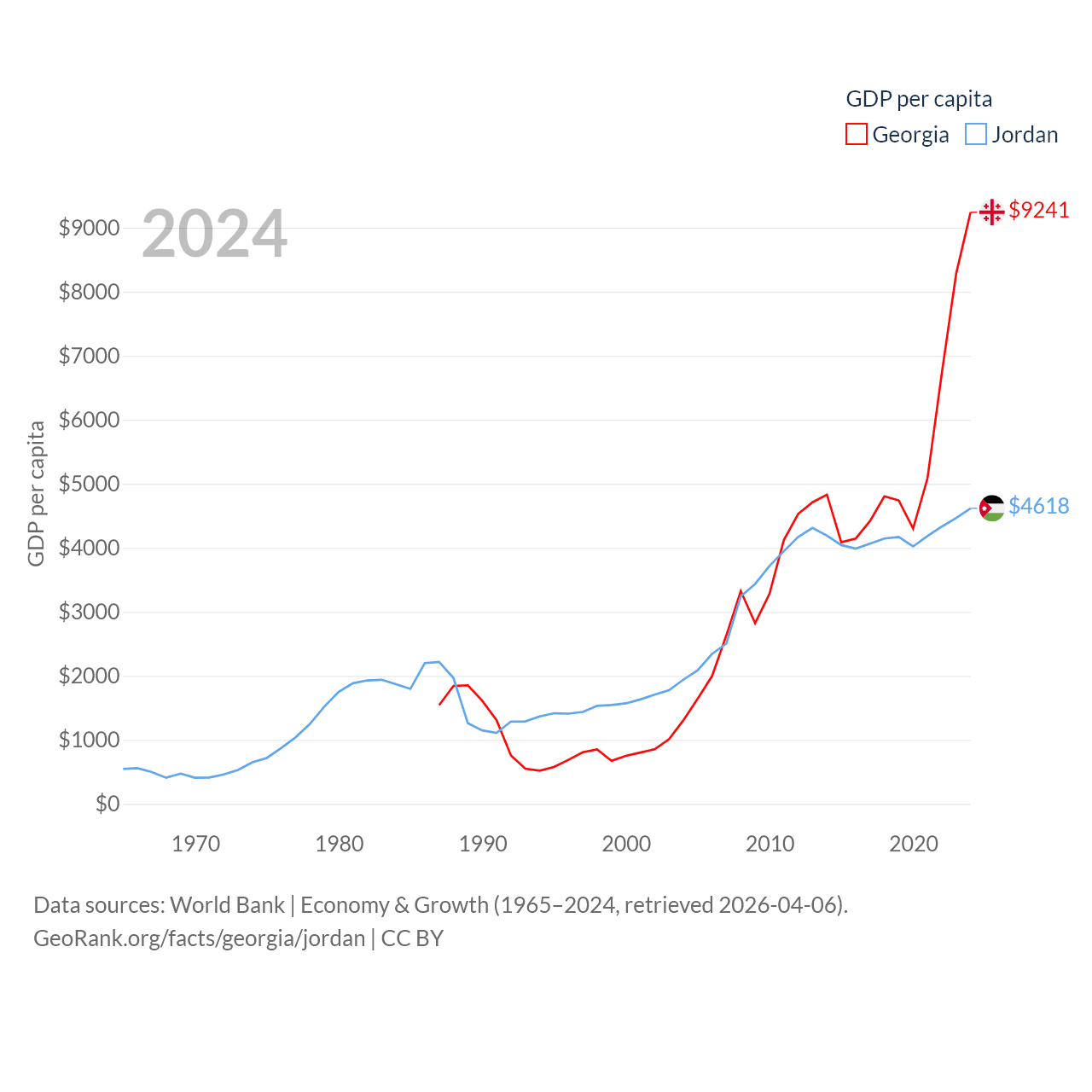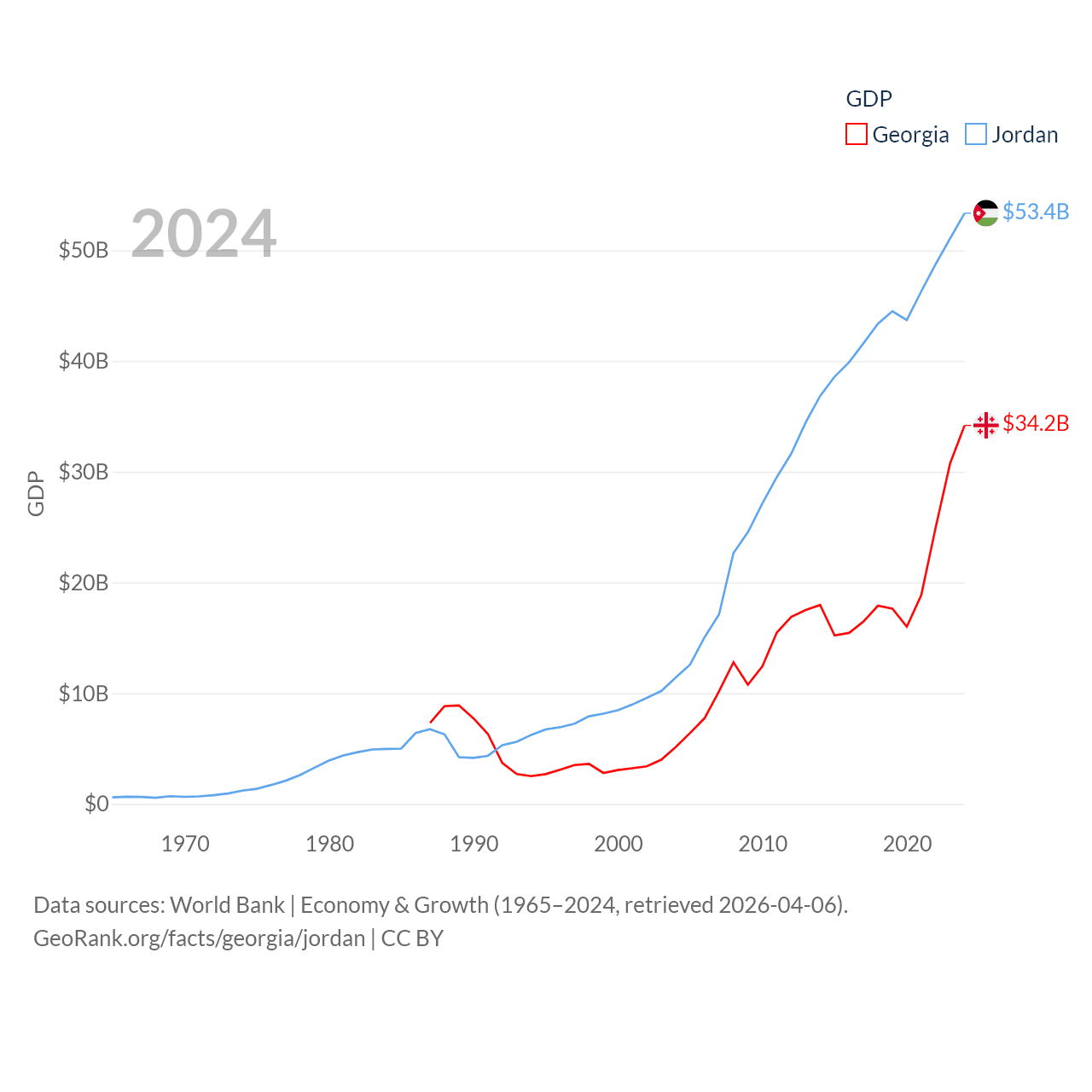 By GDP, Georgia ranks 107/197 ($34.2B) and Jordan ranks 90/197 ($53.4B). By GDP per capita, Georgia ranks 89/197 ($9,241), while Jordan ranks 123/197 ($4,618).