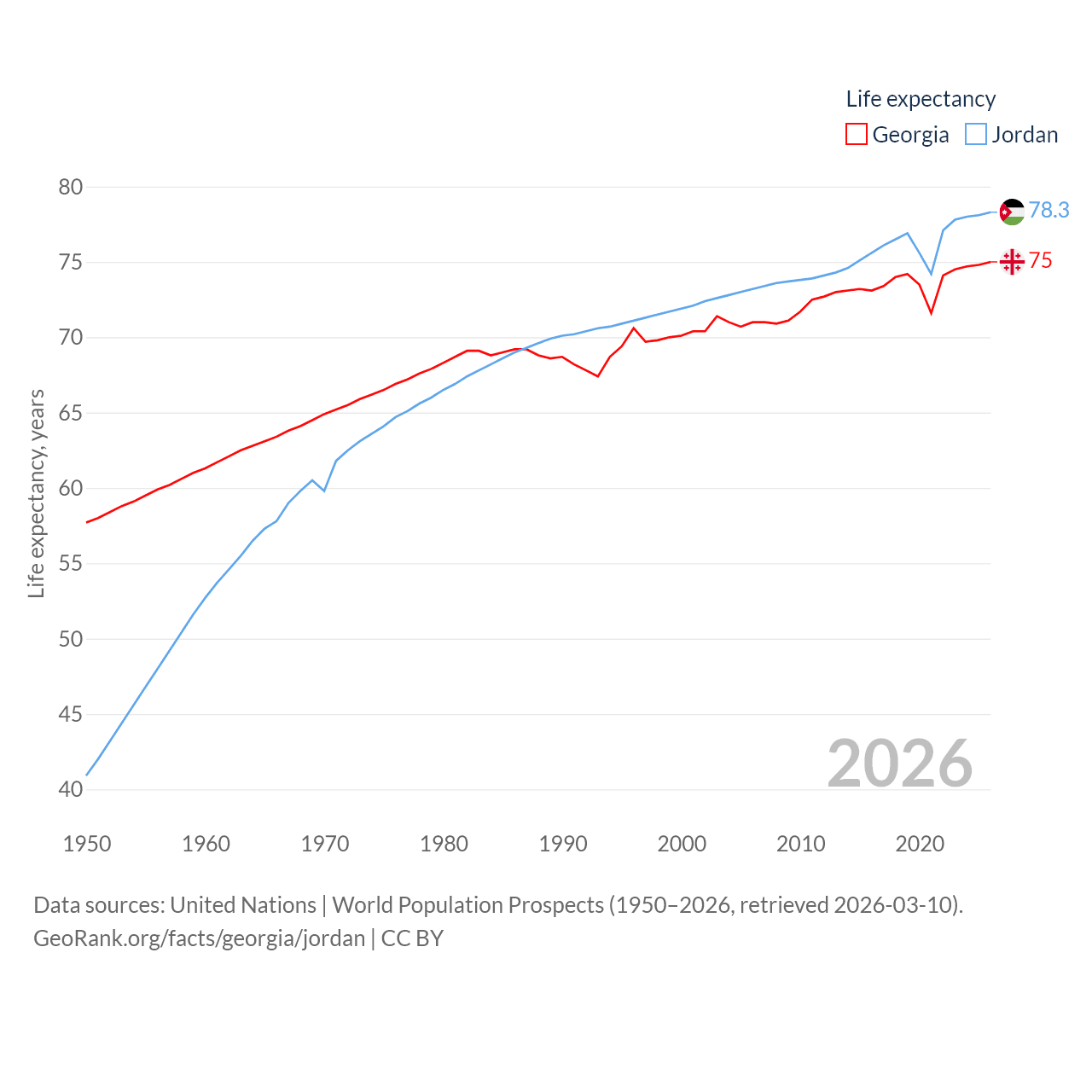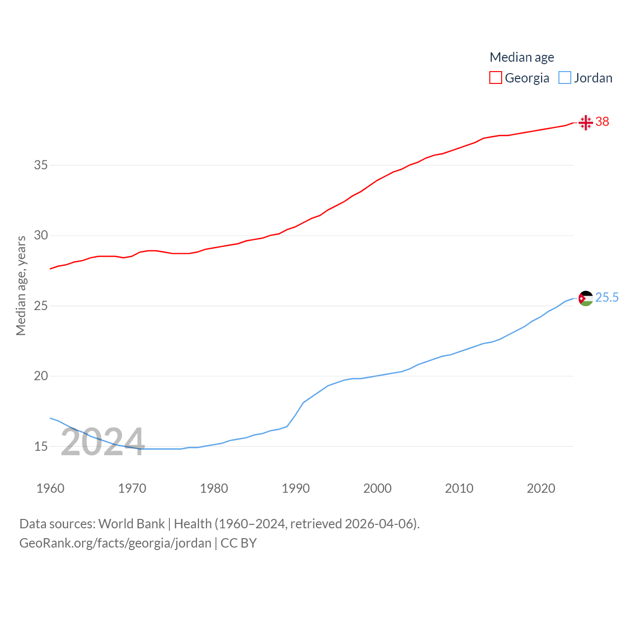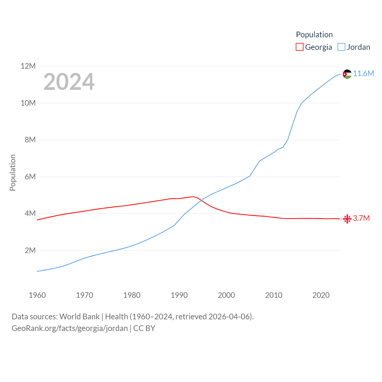 Georgia has a population of 3.7M (ranked 130/197), compared with 11.6M in Jordan (ranked 84/197). Georgia's land area is 26,830 sq mi versus 34,284 sq mi for Jordan (ranked 118th vs. 110th).