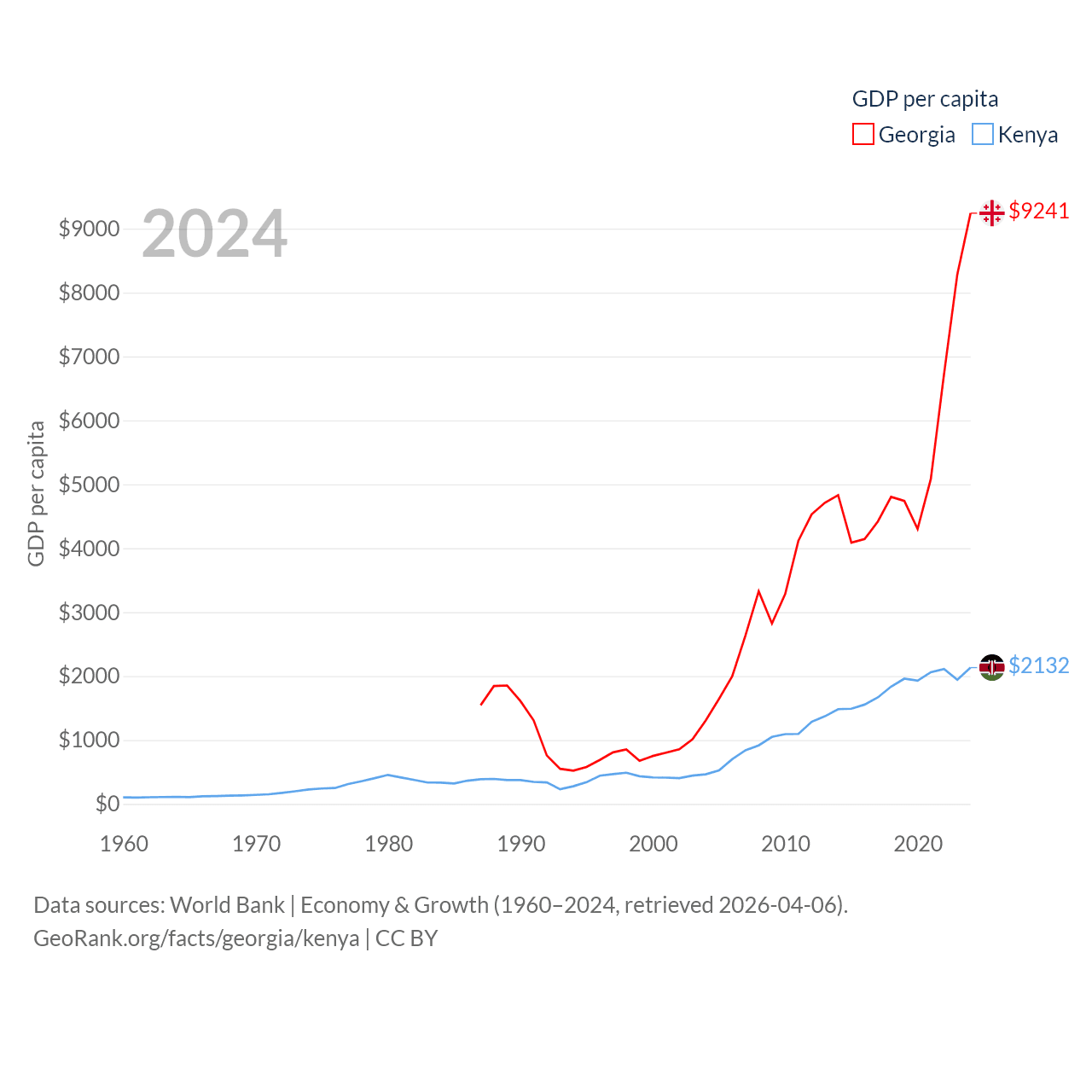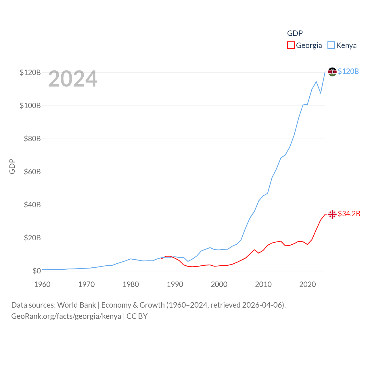 By GDP, Georgia ranks 107/197 ($34.2B) and Kenya ranks 64/197 ($120B). By GDP per capita, Georgia ranks 89/197 ($9,241), while Kenya ranks 154/197 ($2,132).