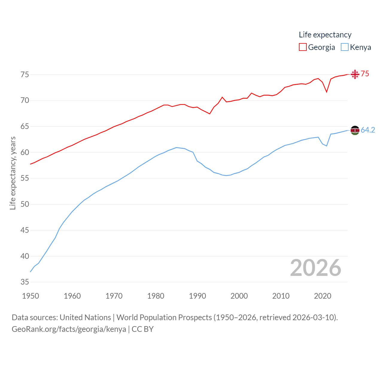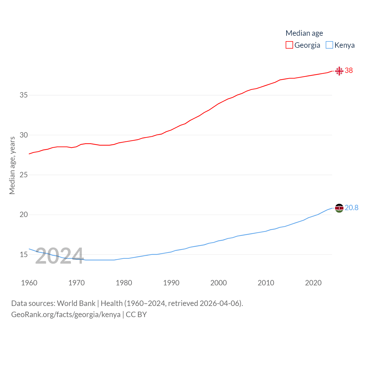 Georgia has a population of 3.7M (ranked 130/197), compared with 56.4M in Kenya (ranked 26/197). Georgia's land area is 26,830 sq mi versus 224,278 sq mi for Kenya (ranked 118th vs. 45th).