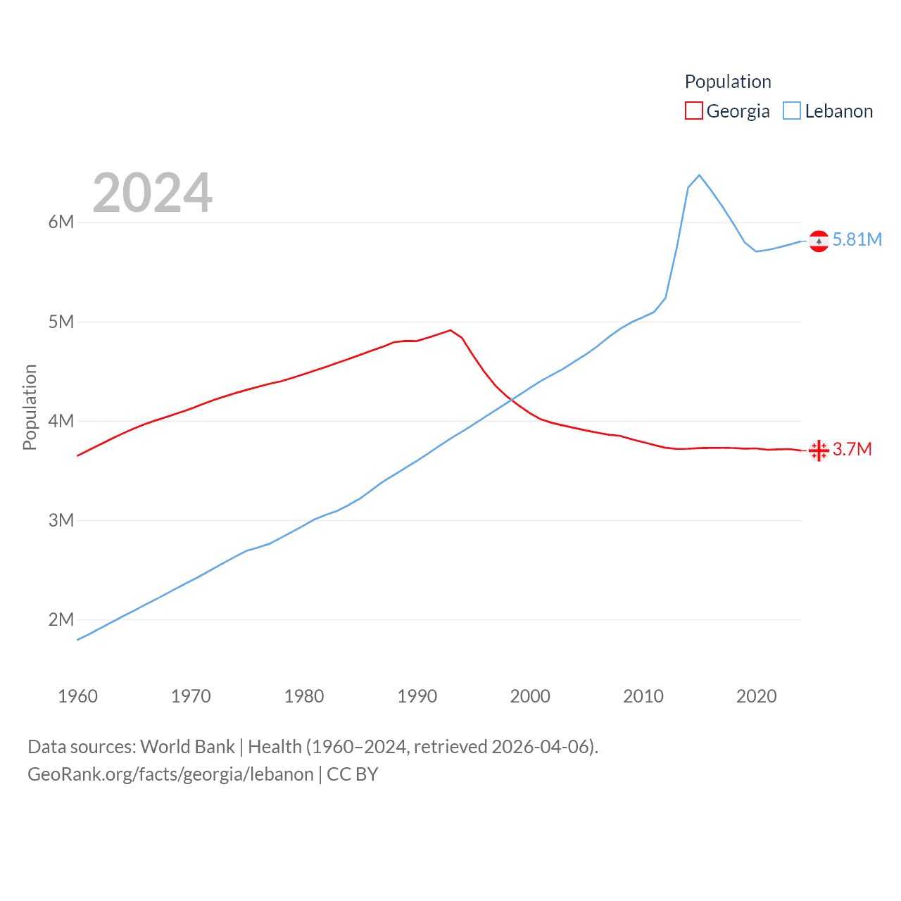 Georgia has a population of 3.7M (ranked 130/197), compared with 5.81M in Lebanon (ranked 115/197). Georgia's land area is 26,830 sq mi versus 3,950 sq mi for Lebanon (ranked 118th vs. 160th).