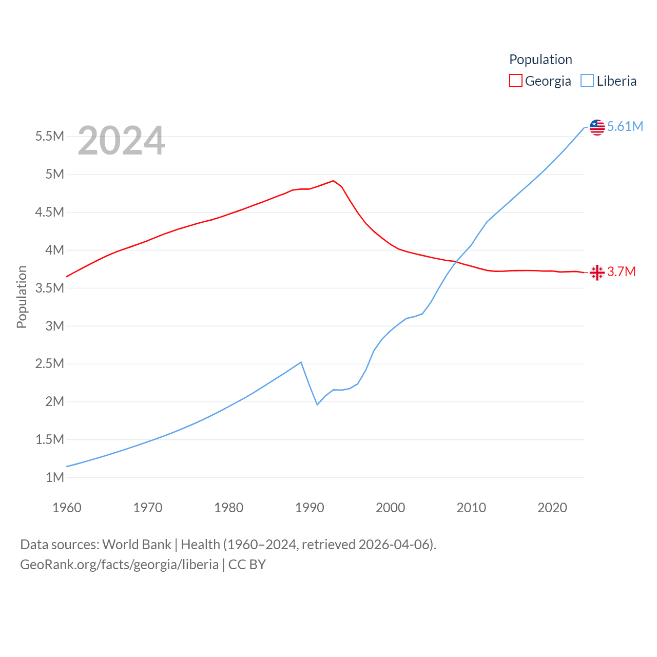 Georgia has a population of 3.7M (ranked 130/197), compared with 5.61M in Liberia (ranked 117/197). Georgia's land area is 26,830 sq mi versus 37,189 sq mi for Liberia (ranked 118th vs. 106th).