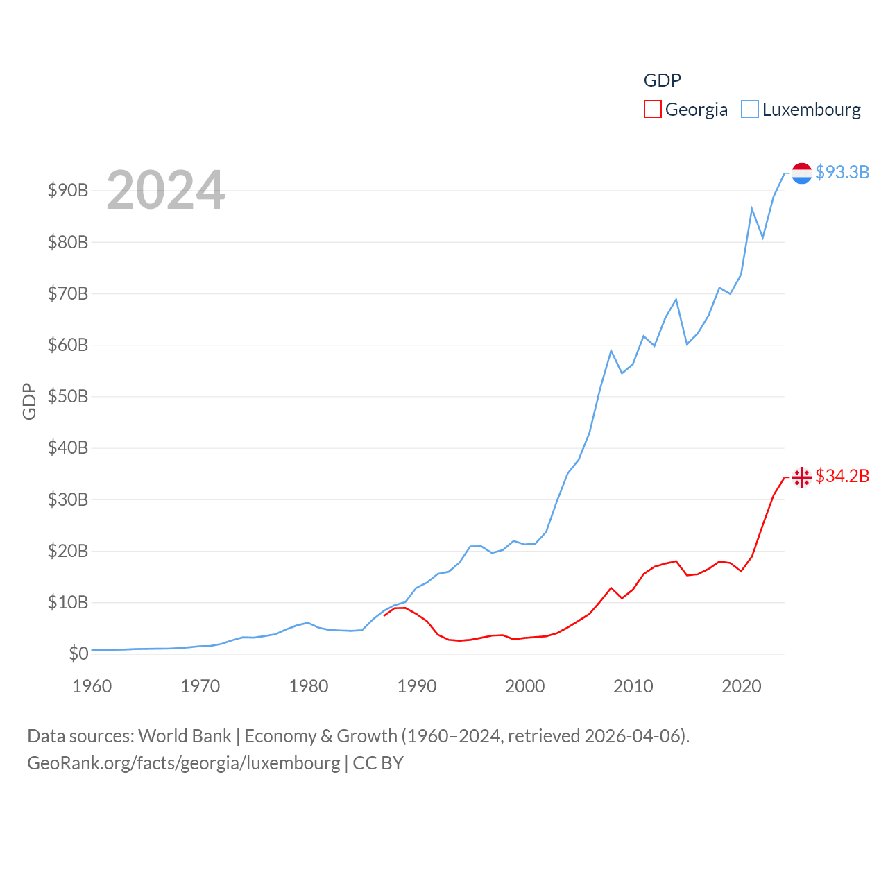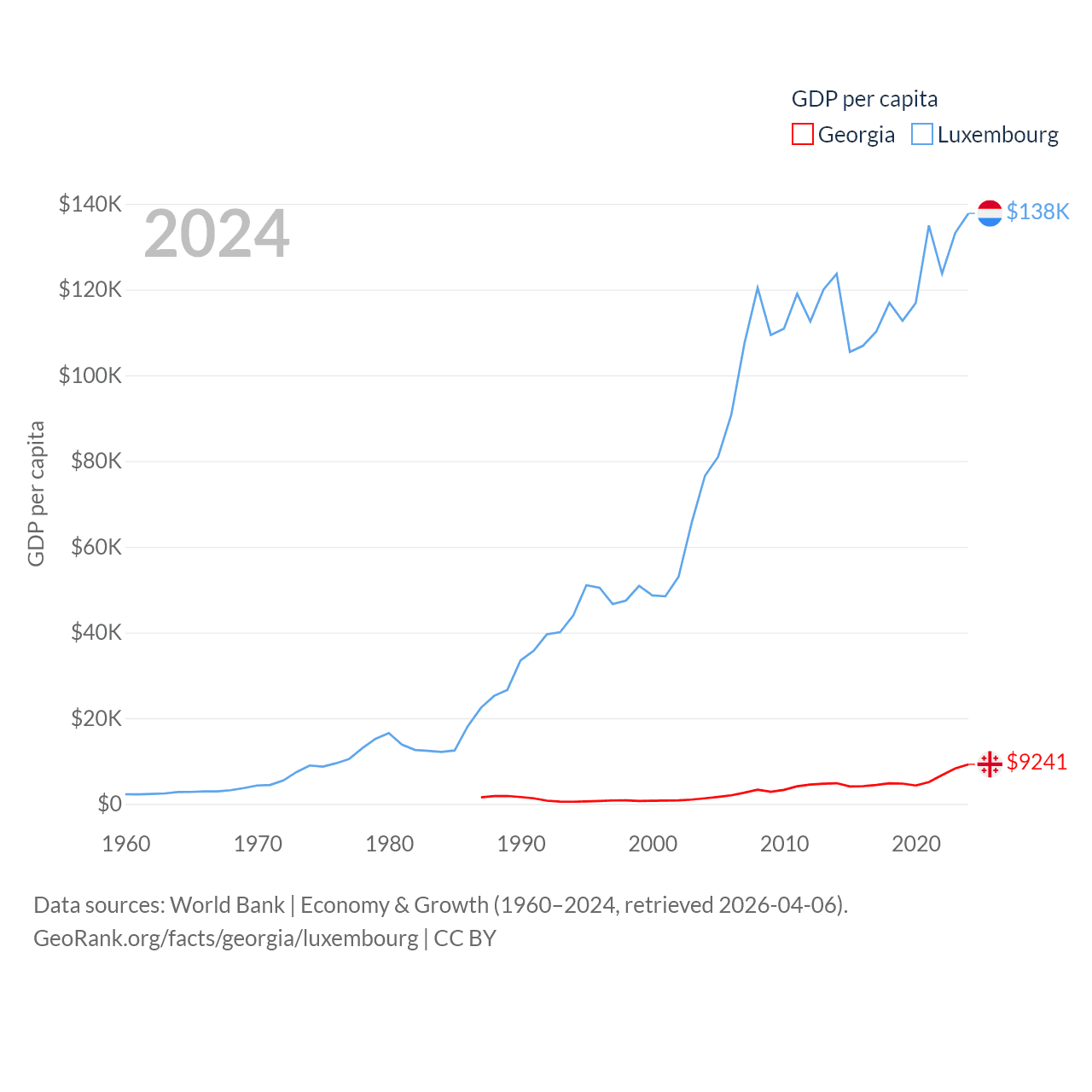 By GDP, Georgia ranks 107/197 ($34.2B) and Luxembourg ranks 74/197 ($93.3B). By GDP per capita, Georgia ranks 89/197 ($9,241), while Luxembourg ranks 3/197 ($137,782).