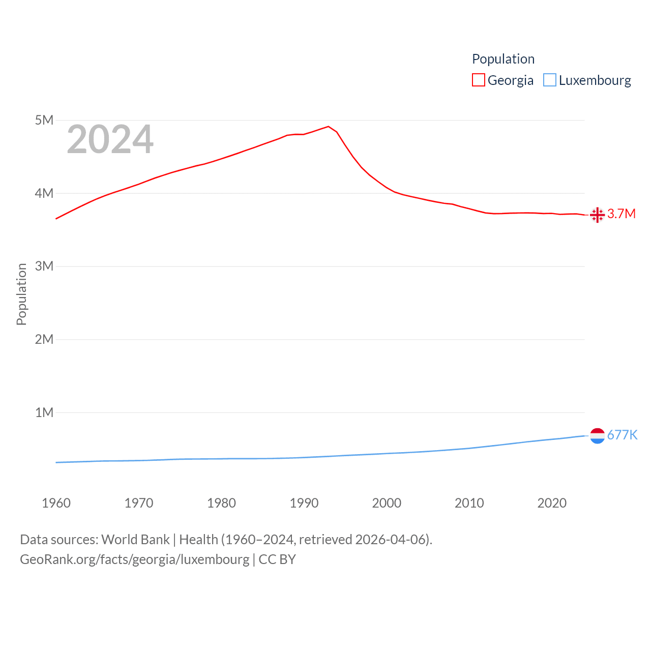 Georgia has a population of 3.7M (ranked 130/197), compared with 677K in Luxembourg (ranked 164/197). Georgia's land area is 26,830 sq mi versus 994 sq mi for Luxembourg (ranked 118th vs. 169th).