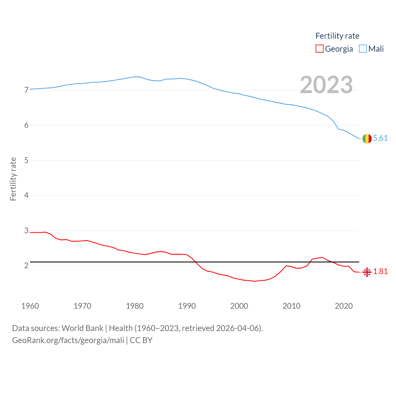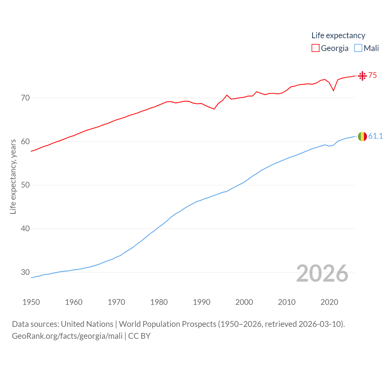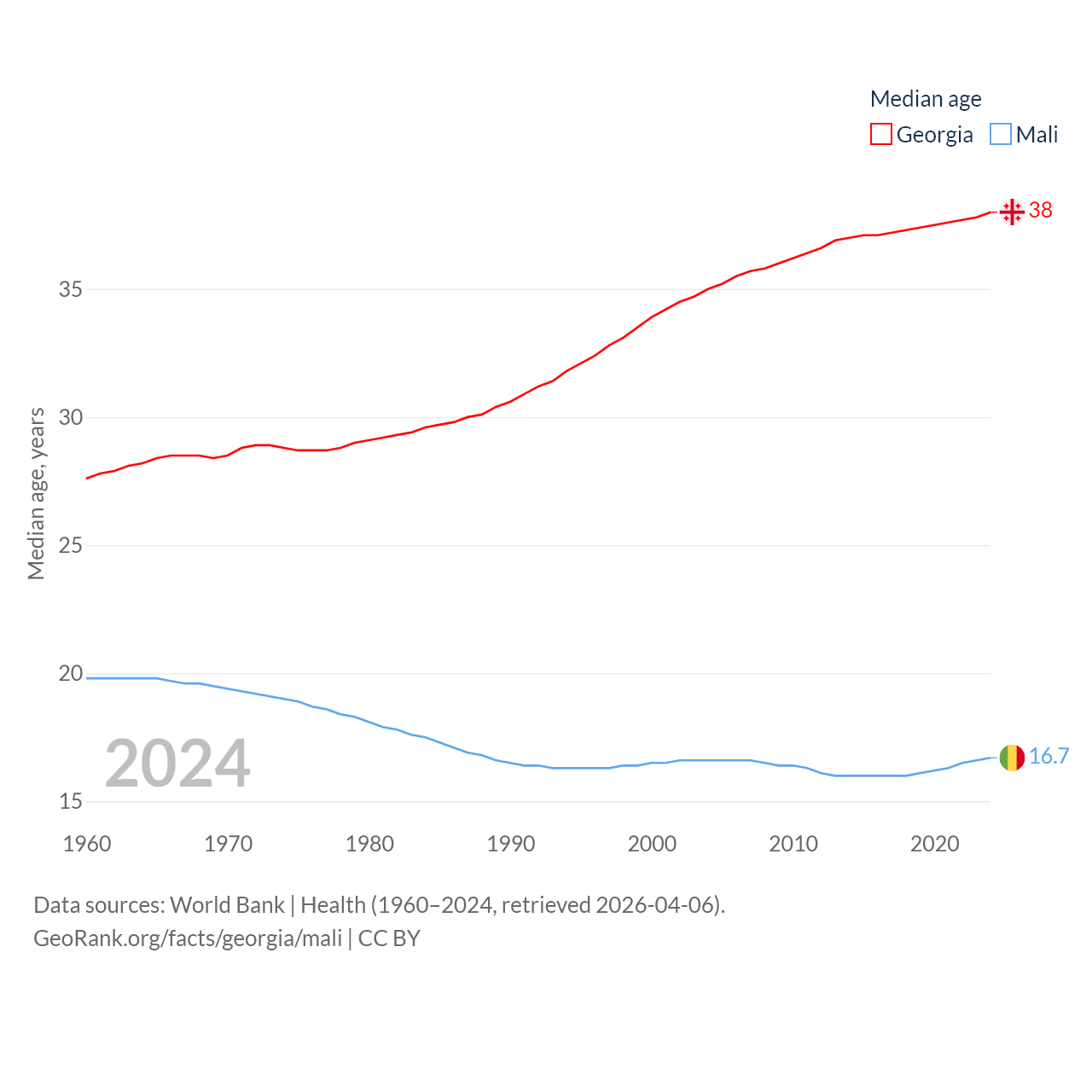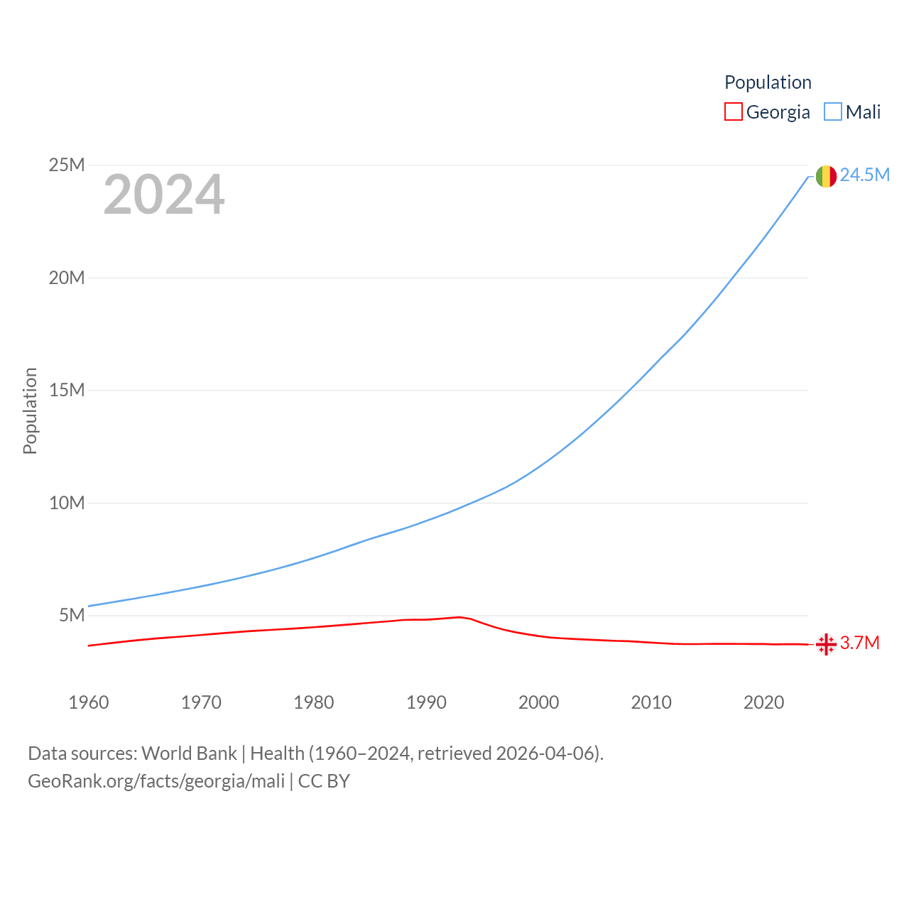 Georgia has a population of 3.7M (ranked 130/197), compared with 24.5M in Mali (ranked 58/197). Georgia's land area is 26,830 sq mi versus 471,118 sq mi for Mali (ranked 118th vs. 23rd).