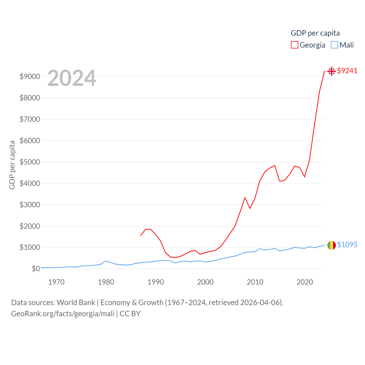 By GDP, Georgia ranks 107/197 ($34.2B) and Mali ranks 113/197 ($26.8B). By GDP per capita, Georgia ranks 89/197 ($9,241), while Mali ranks 173/197 ($1,095).