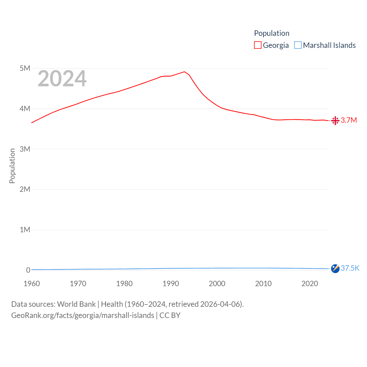 Georgia has a population of 3.7M (ranked 130/197), compared with 37.5K in The Marshall Islands (ranked 192/197). Georgia's land area is 26,830 sq mi versus 69.5 sq mi for The Marshall Islands (ranked 118th vs. 191st).