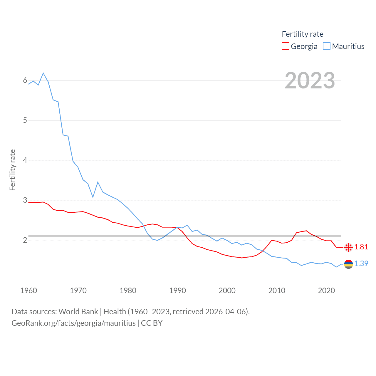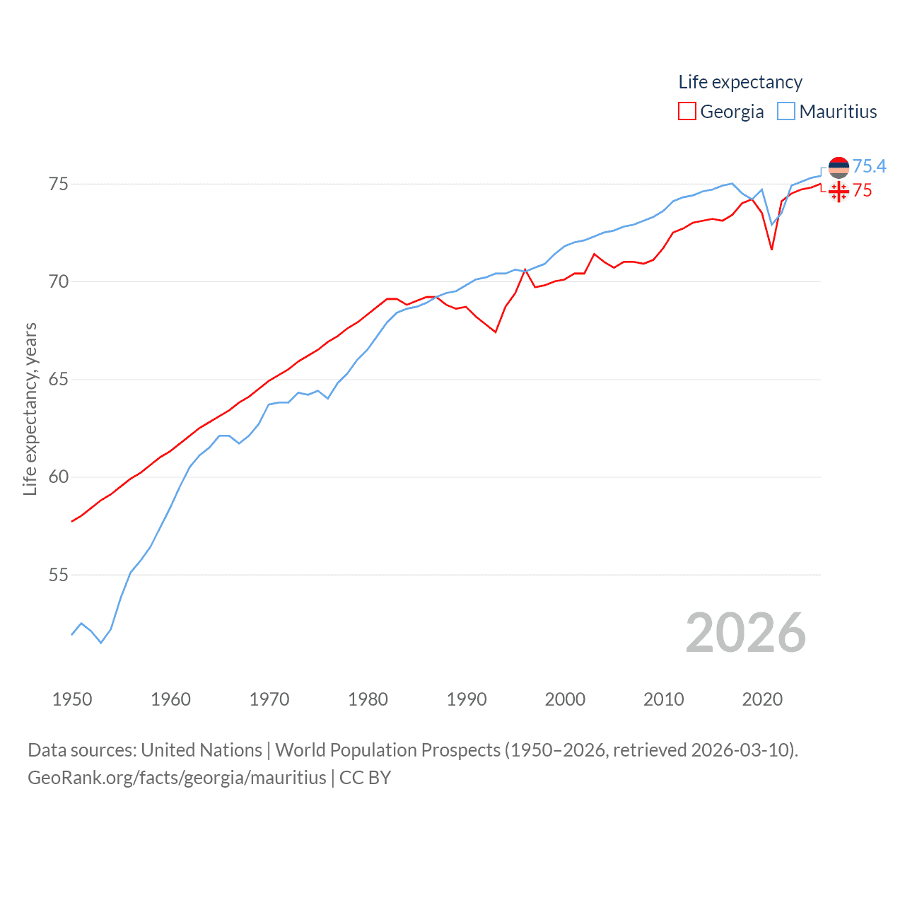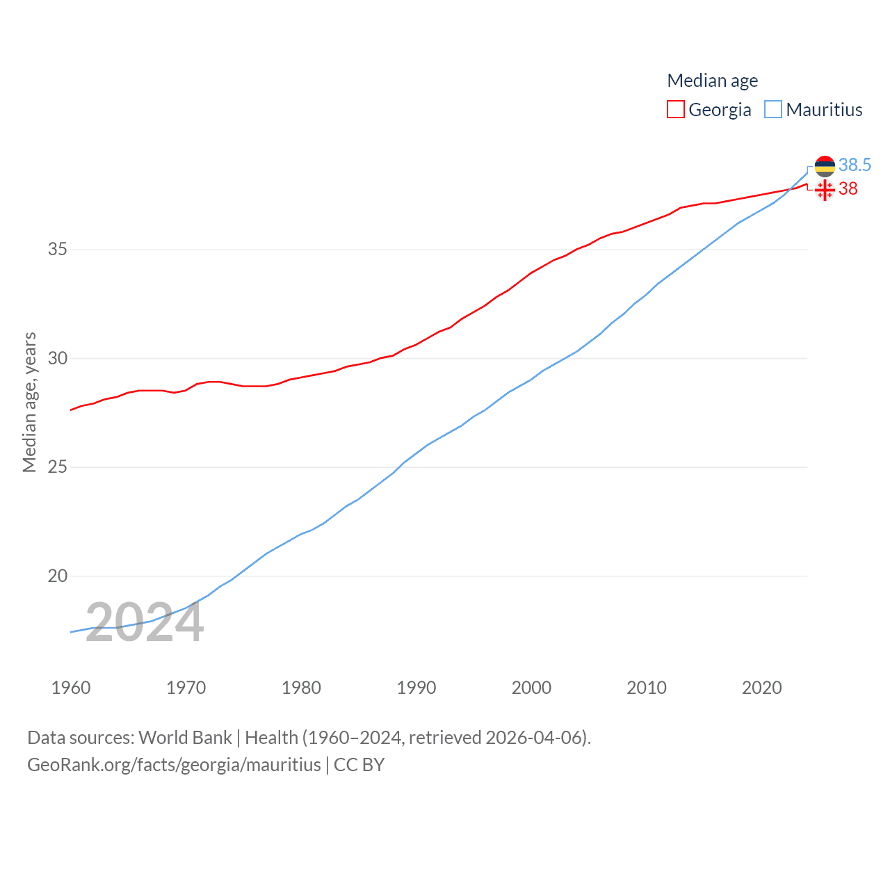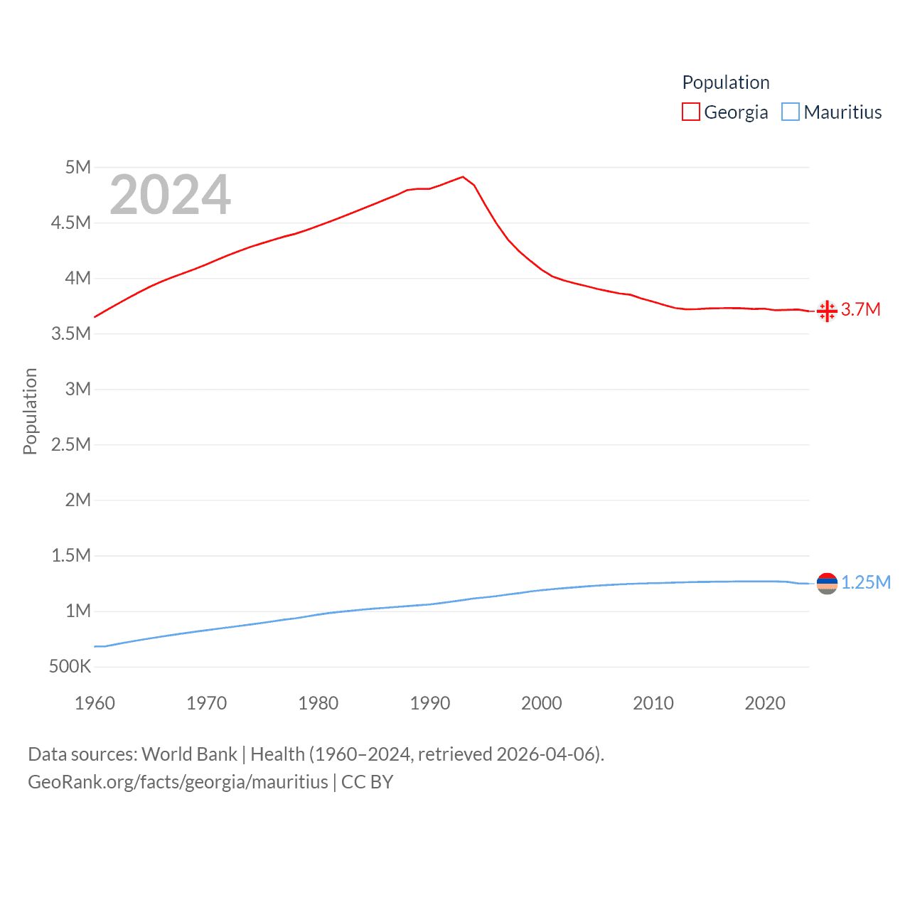 Georgia has a population of 3.7M (ranked 130/197), compared with 1.25M in Mauritius (ranked 156/197). Georgia's land area is 26,830 sq mi versus 771 sq mi for Mauritius (ranked 118th vs. 170th).