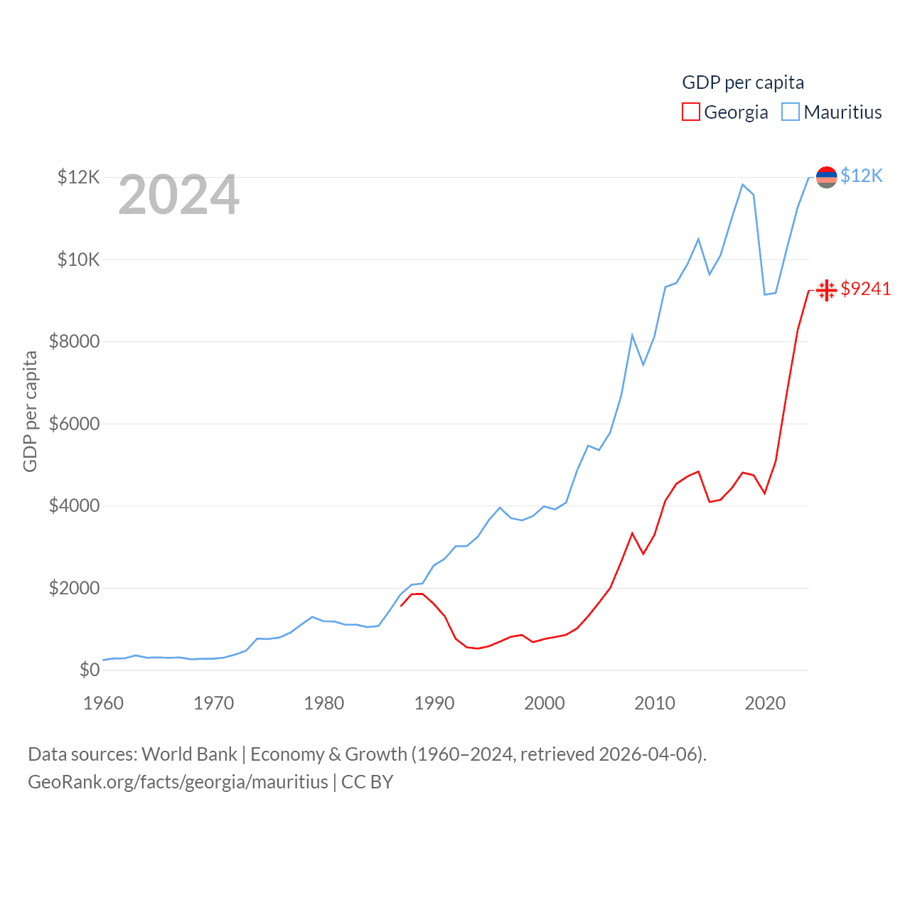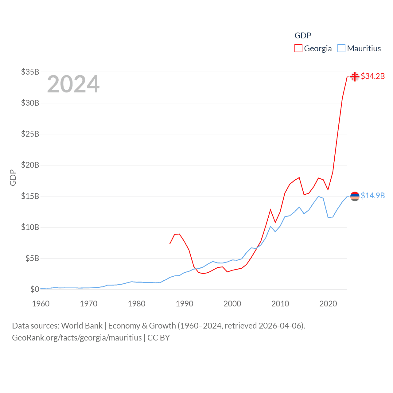 By GDP, Georgia ranks 107/197 ($34.2B) and Mauritius ranks 143/197 ($14.9B). By GDP per capita, Georgia ranks 89/197 ($9,241), while Mauritius ranks 78/197 ($11,991).