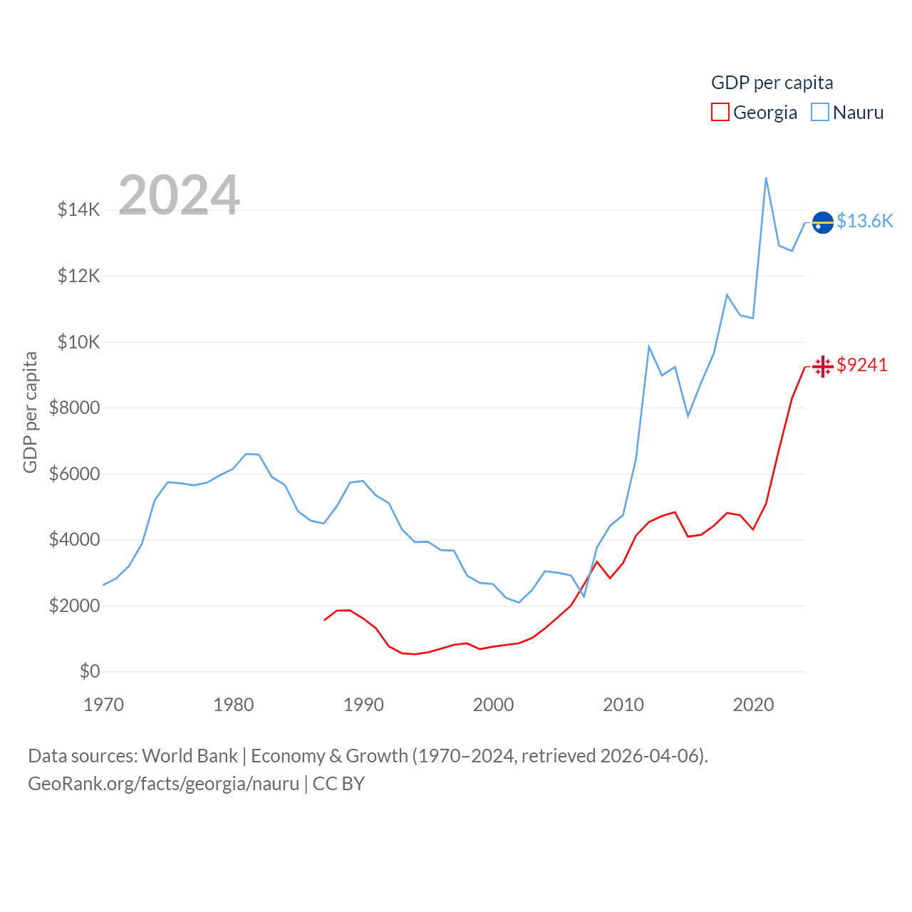 By GDP, Georgia ranks 107/197 ($34.2B) and Nauru ranks 195/197 ($163M). By GDP per capita, Georgia ranks 89/197 ($9,241), while Nauru ranks 74/197 ($13,609).