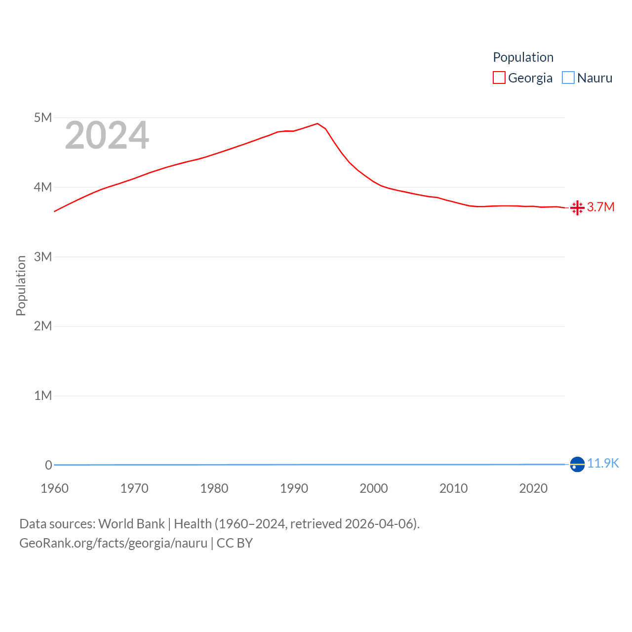 Georgia has a population of 3.7M (ranked 130/197), compared with 11.9K in Nauru (ranked 195/197). Georgia's land area is 26,830 sq mi versus 7.72 sq mi for Nauru (ranked 118th vs. 195th).