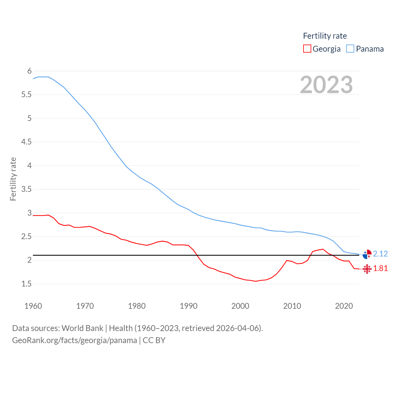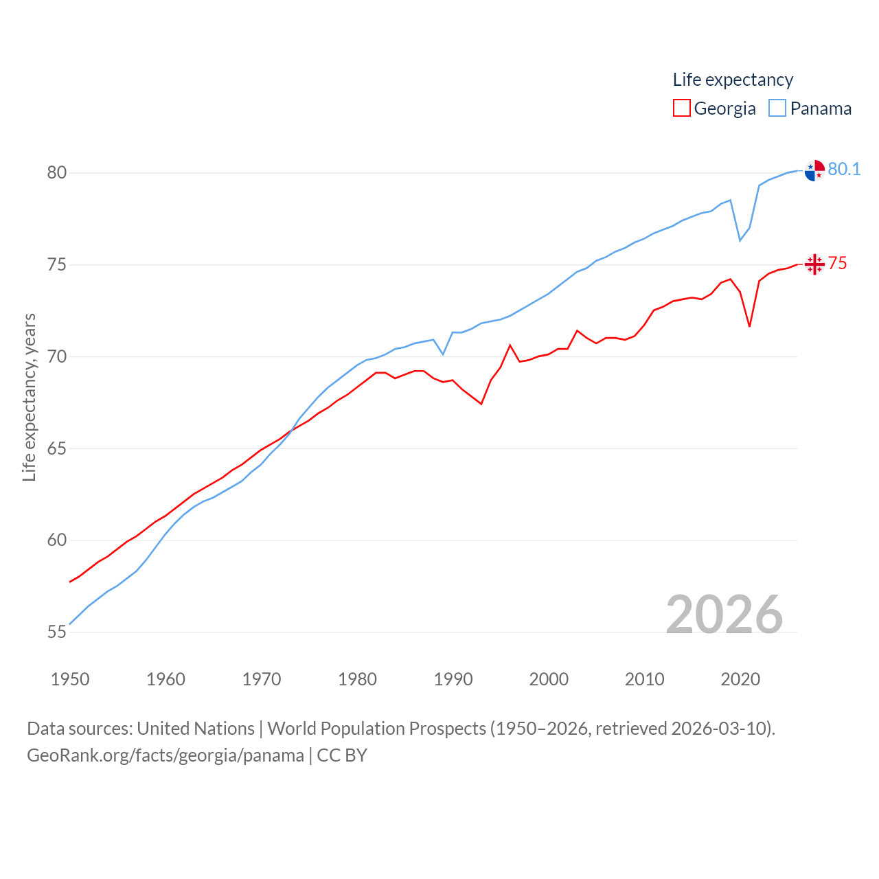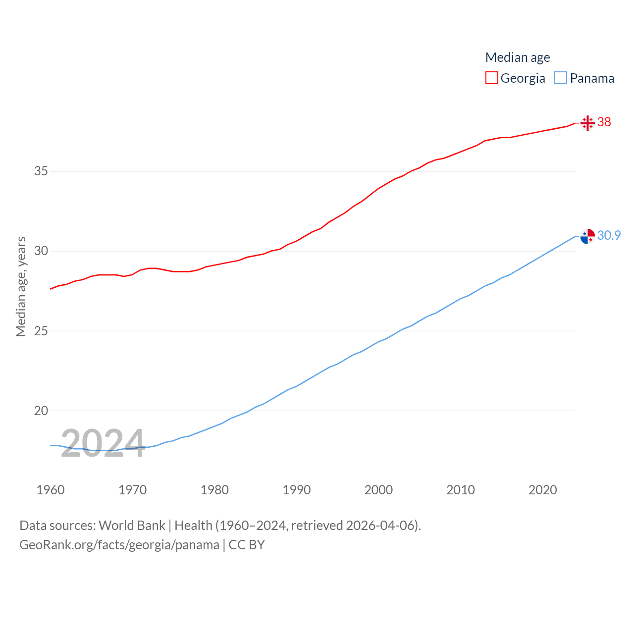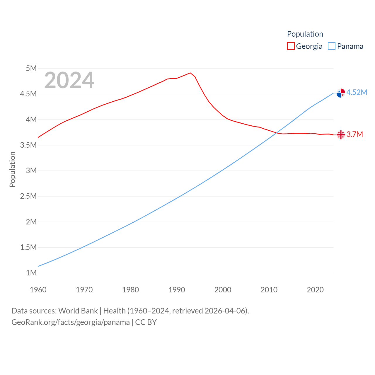 Georgia has a population of 3.7M (ranked 130/197), compared with 4.52M in Panama (ranked 128/197). Georgia's land area is 26,830 sq mi versus 28,641 sq mi for Panama (ranked 118th vs. 115th).
