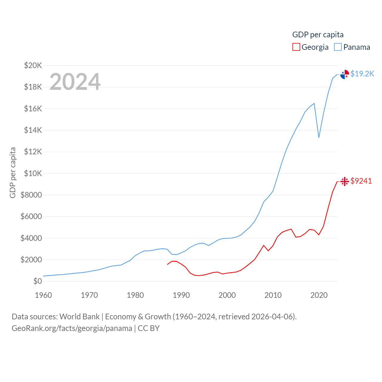 By GDP, Georgia ranks 107/197 ($34.2B) and Panama ranks 78/197 ($86.5B). By GDP per capita, Georgia ranks 89/197 ($9,241), while Panama ranks 60/197 ($19,161).