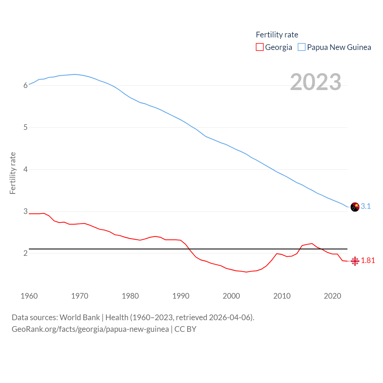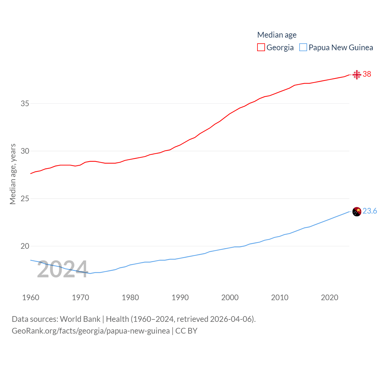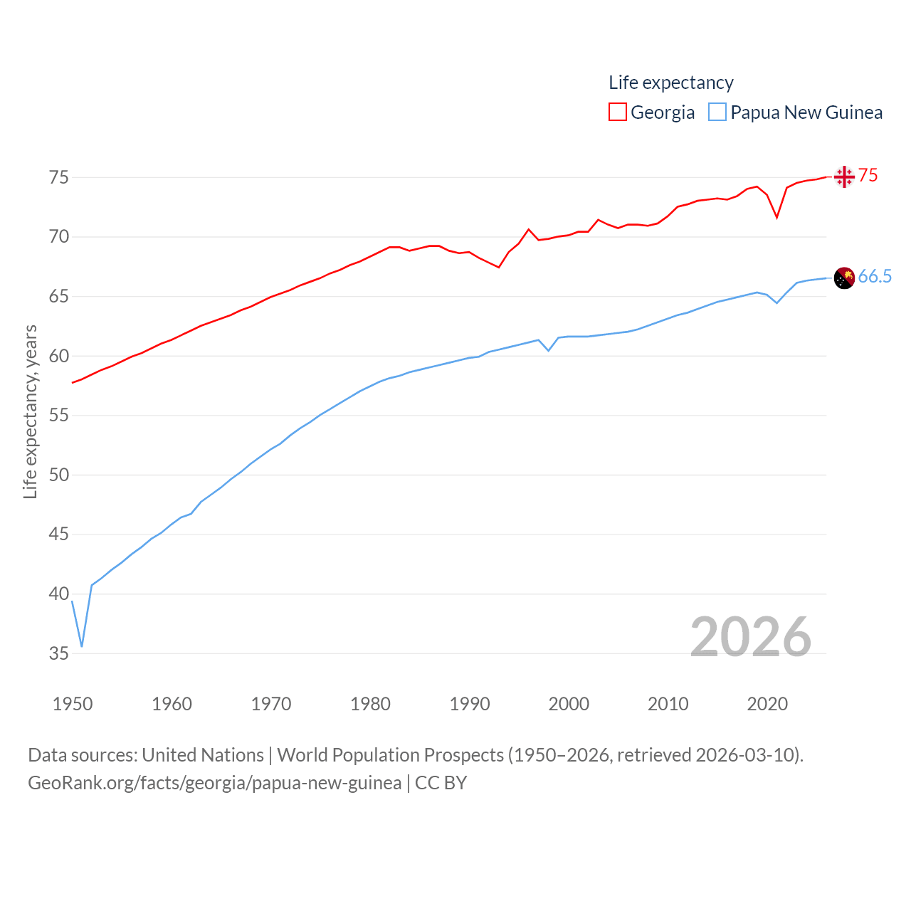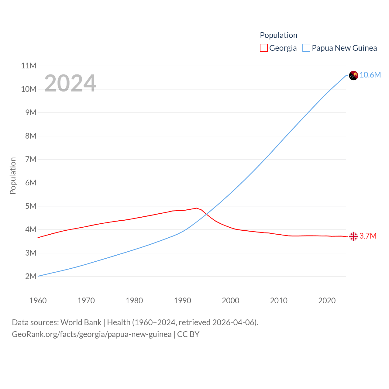 Georgia has a population of 3.7M (ranked 130/197), compared with 10.6M in Papua New Guinea (ranked 92/197). Georgia's land area is 26,830 sq mi versus 174,850 sq mi for Papua New Guinea (ranked 118th vs. 54th).