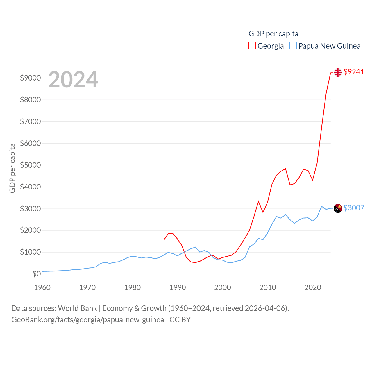 By GDP, Georgia ranks 107/197 ($34.2B) and Papua New Guinea ranks 110/197 ($31.8B). By GDP per capita, Georgia ranks 89/197 ($9,241), while Papua New Guinea ranks 140/197 ($3,007).