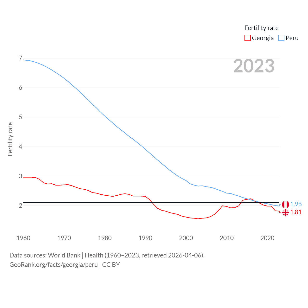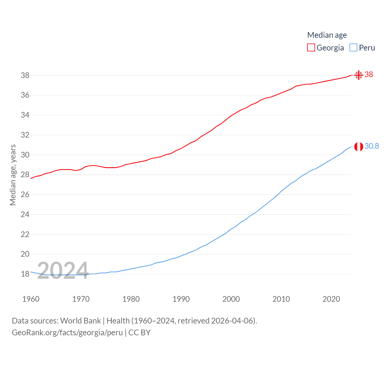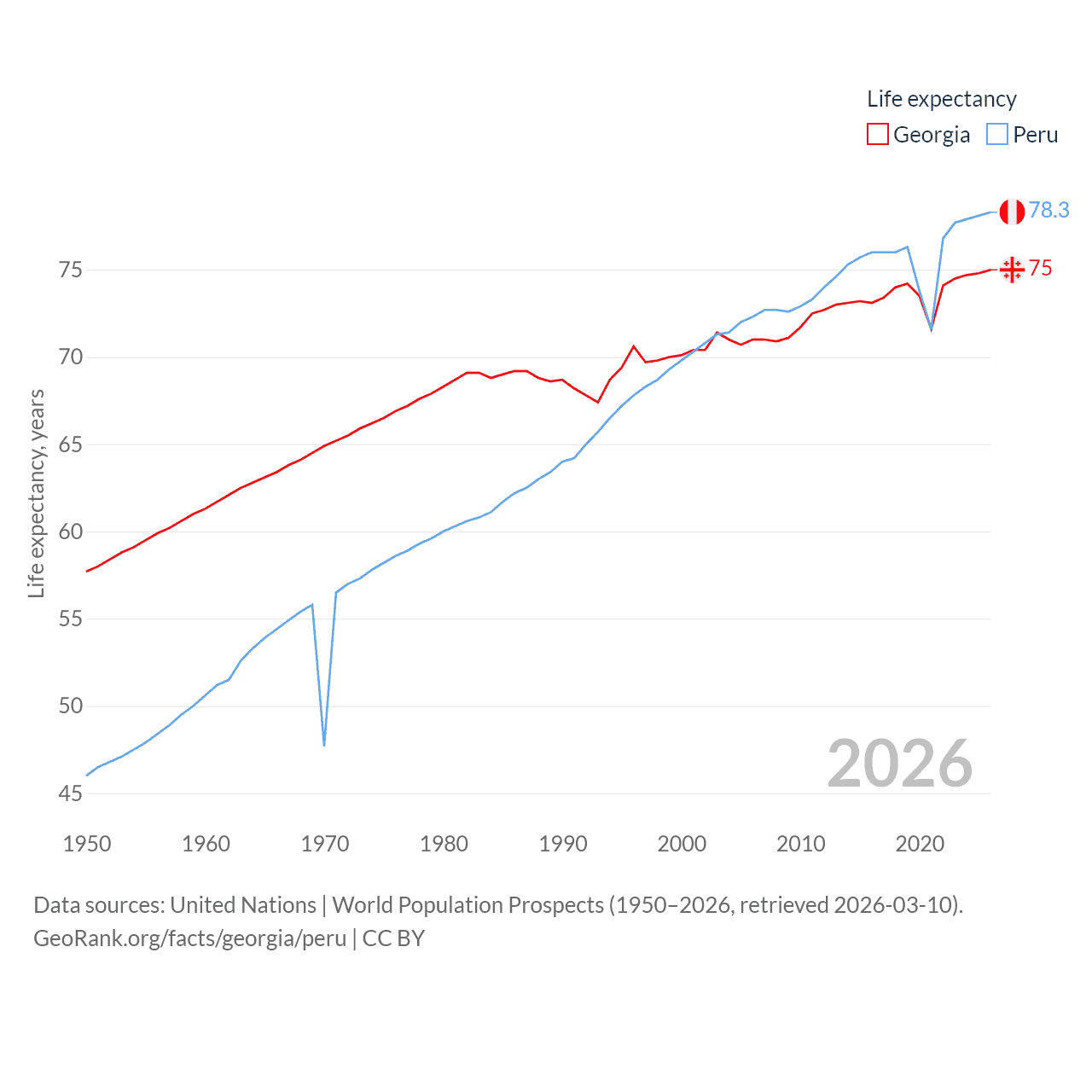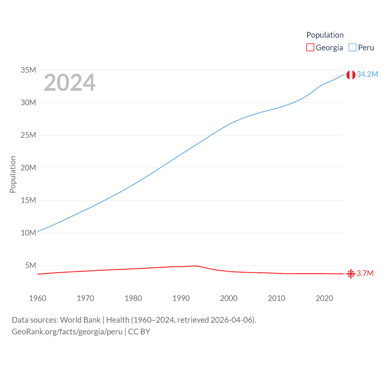 Georgia has a population of 3.7M (ranked 130/197), compared with 34.2M in Peru (ranked 48/197). Georgia's land area is 26,830 sq mi versus 494,211 sq mi for Peru (ranked 118th vs. 19th).