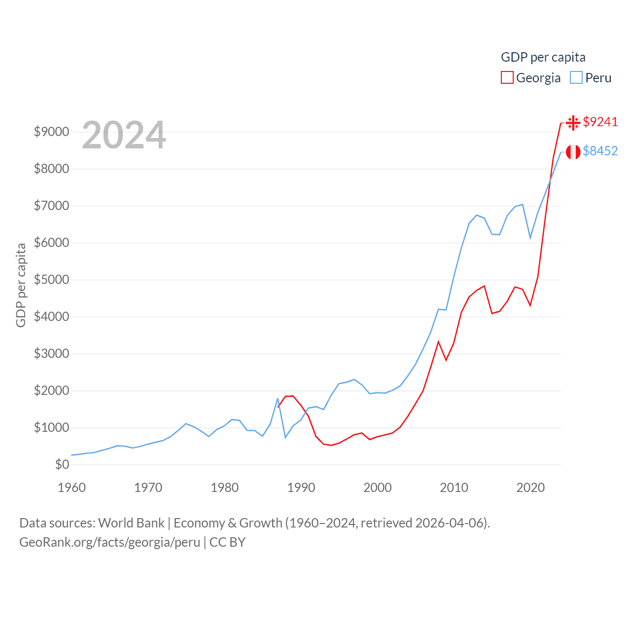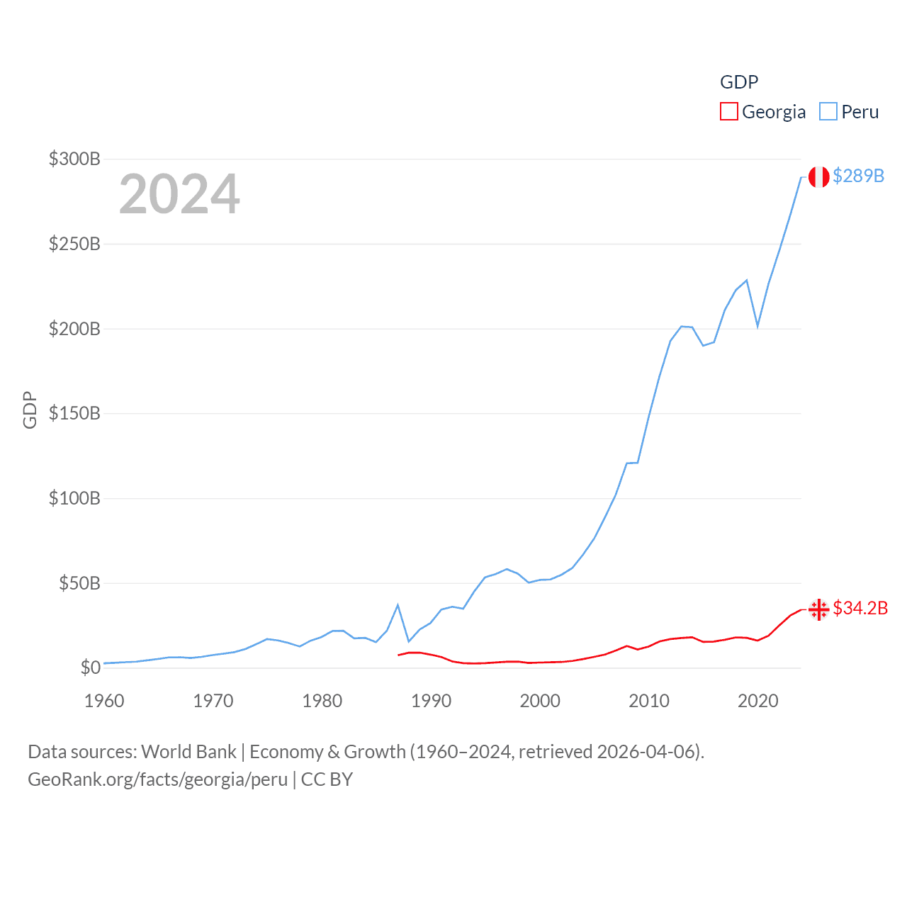 By GDP, Georgia ranks 107/197 ($34.2B) and Peru ranks 49/197 ($289B). By GDP per capita, Georgia ranks 89/197 ($9,241), while Peru ranks 91/197 ($8,452).