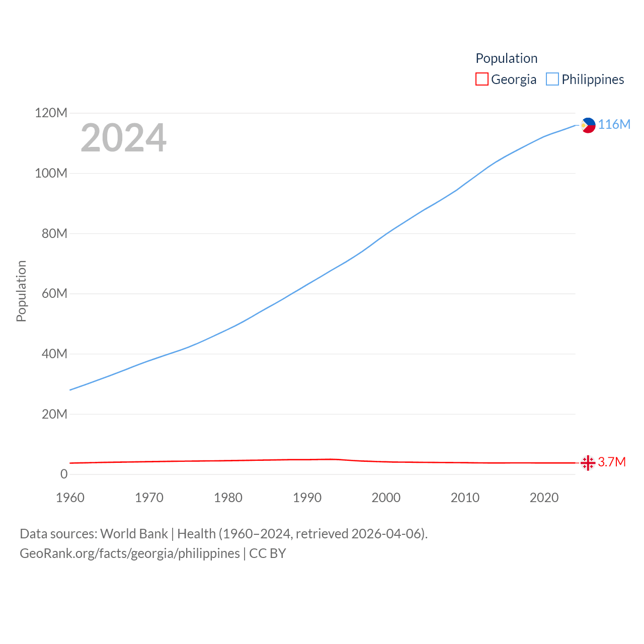 Georgia has a population of 3.7M (ranked 130/197), compared with 116M in The Philippines (ranked 14/197). Georgia's land area is 26,830 sq mi versus 115,124 sq mi for The Philippines (ranked 118th vs. 71st).