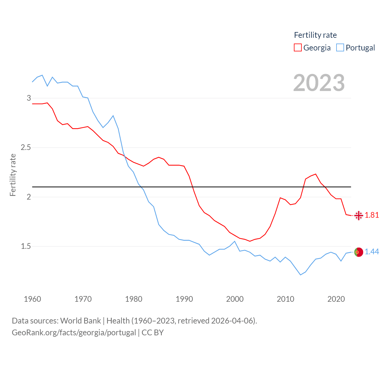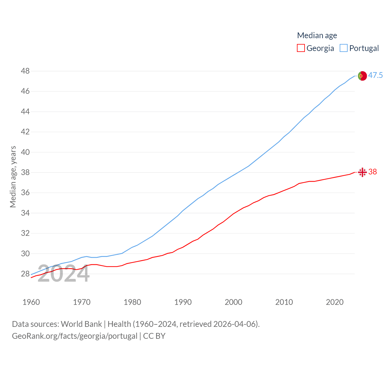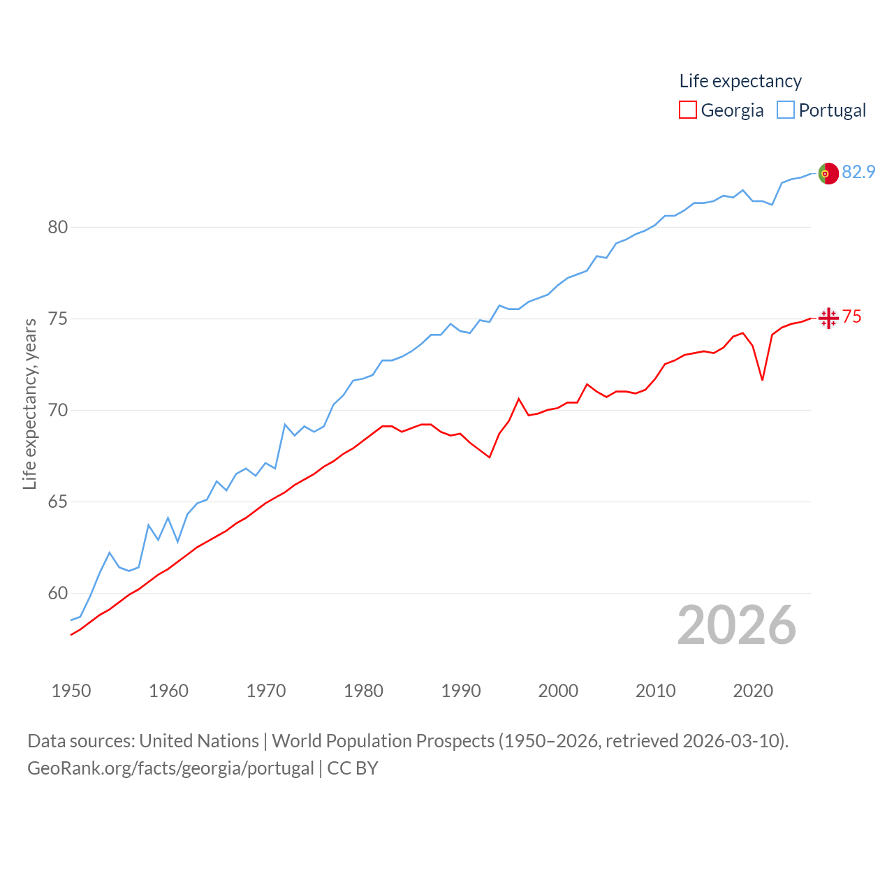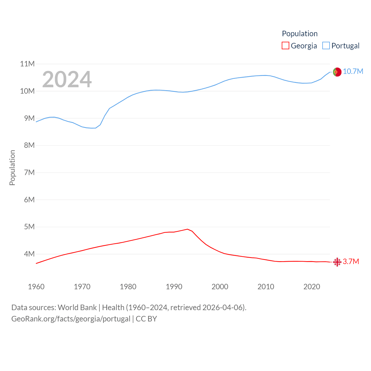 Georgia has a population of 3.7M (ranked 130/197), compared with 10.7M in Portugal (ranked 90/197). Georgia's land area is 26,830 sq mi versus 35,369 sq mi for Portugal (ranked 118th vs. 108th).