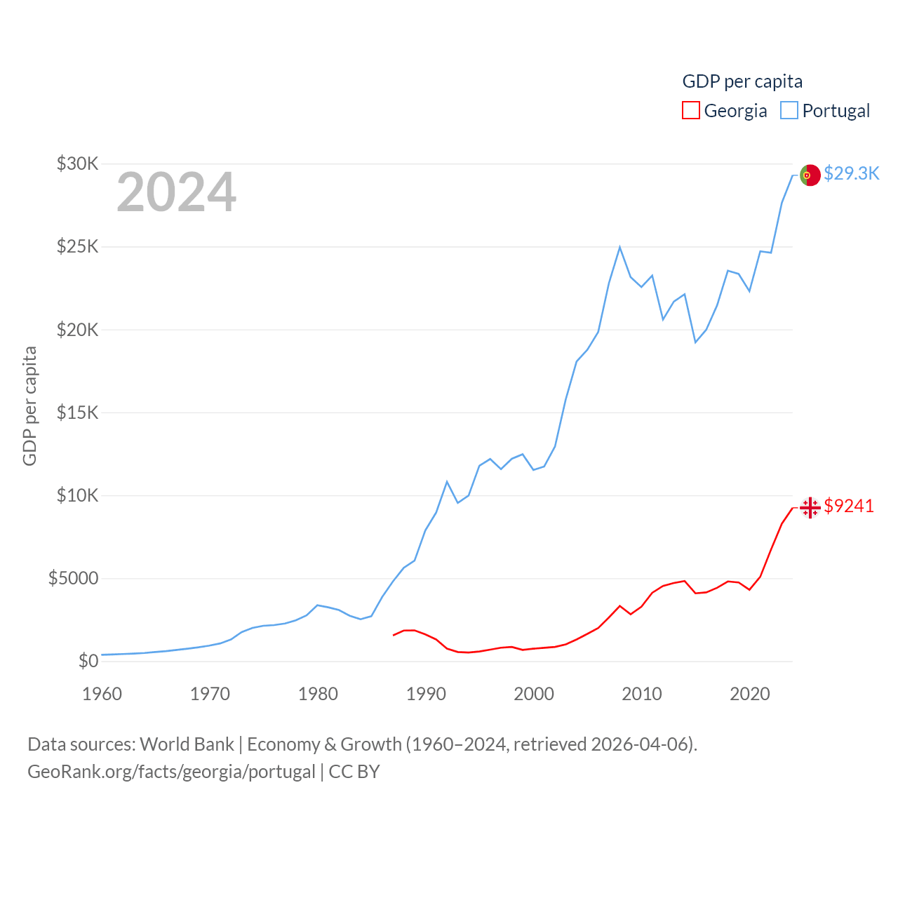 By GDP, Georgia ranks 107/197 ($34.2B) and Portugal ranks 46/197 ($313B). By GDP per capita, Georgia ranks 89/197 ($9,241), while Portugal ranks 44/197 ($29,292).