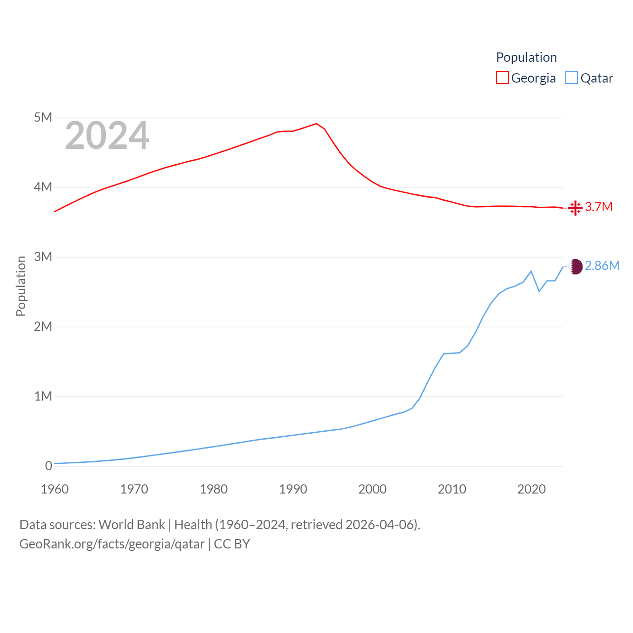 Georgia has a population of 3.7M (ranked 130/197), compared with 2.86M in Qatar (ranked 138/197). Georgia's land area is 26,830 sq mi versus 4,436 sq mi for Qatar (ranked 118th vs. 158th).