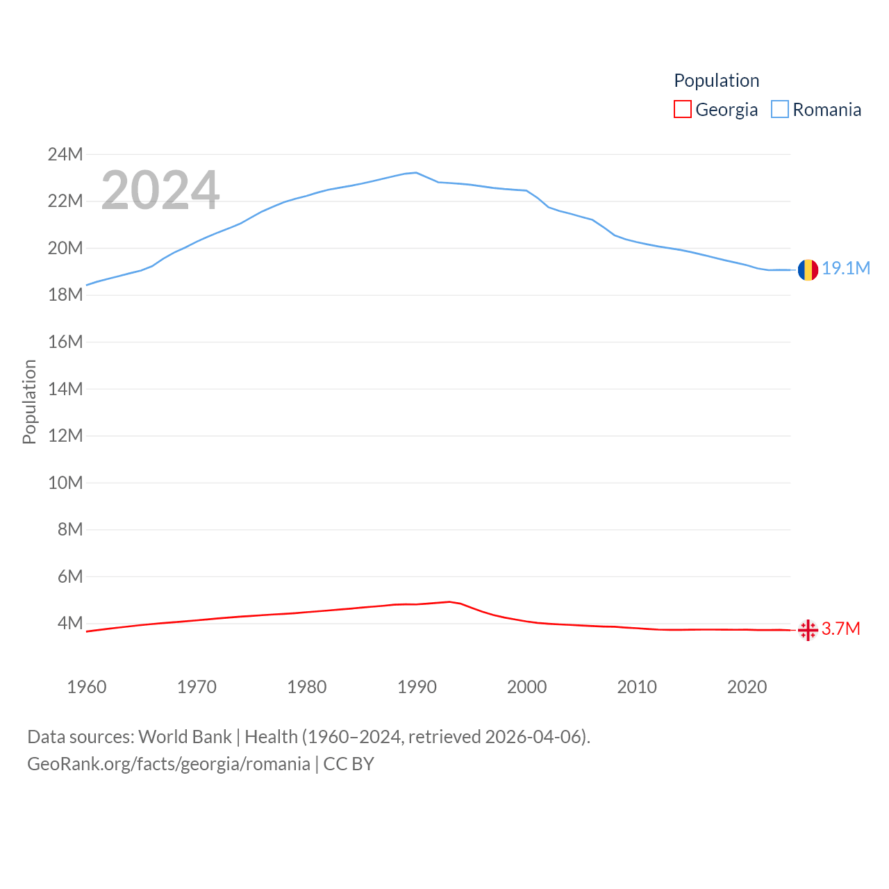 Georgia has a population of 3.7M (ranked 130/197), compared with 19.1M in Romania (ranked 67/197). Georgia's land area is 26,830 sq mi versus 88,834 sq mi for Romania (ranked 118th vs. 80th).