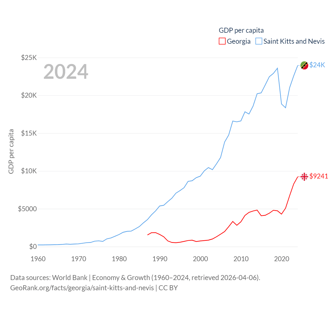 By GDP, Georgia ranks 107/197 ($34.2B) and Saint Kitts and Nevis ranks 187/197 ($1.12B). By GDP per capita, Georgia ranks 89/197 ($9,241), while Saint Kitts and Nevis ranks 51/197 ($23,961).