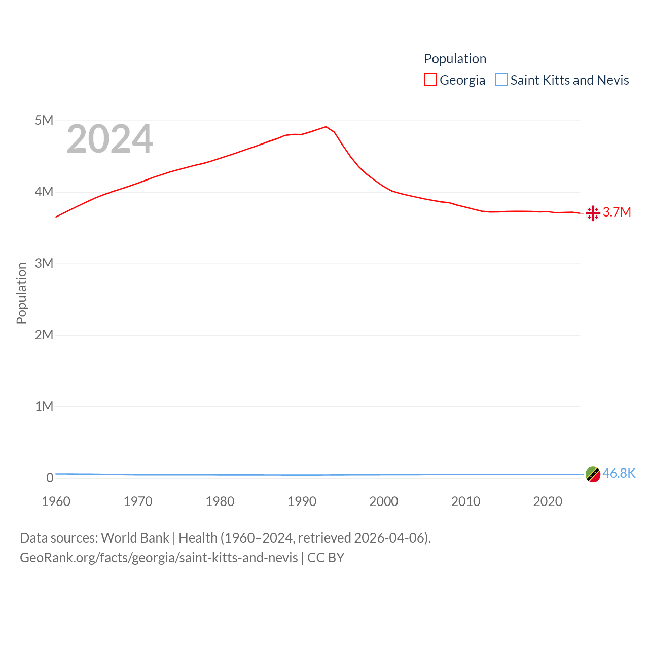 Georgia has a population of 3.7M (ranked 130/197), compared with 46.8K in Saint Kitts and Nevis (ranked 189/197). Georgia's land area is 26,830 sq mi versus 100.4 sq mi for Saint Kitts and Nevis (ranked 118th vs. 189th).