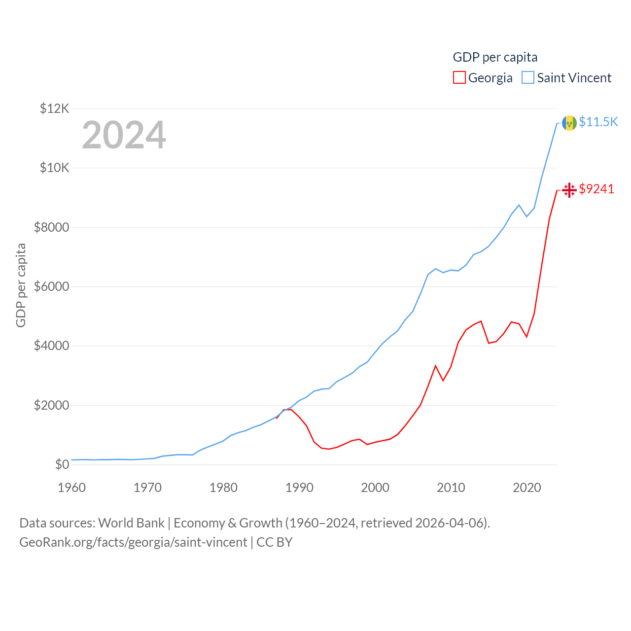 By GDP, Georgia ranks 107/197 ($34.2B) and Saint Vincent ranks 186/197 ($1.16B). By GDP per capita, Georgia ranks 89/197 ($9,241), while Saint Vincent ranks 81/197 ($11,501).
