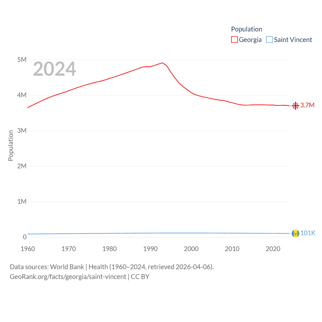 Georgia has a population of 3.7M (ranked 130/197), compared with 101K in Saint Vincent (ranked 184/197). Georgia's land area is 26,830 sq mi versus 150.6 sq mi for Saint Vincent (ranked 118th vs. 185th).