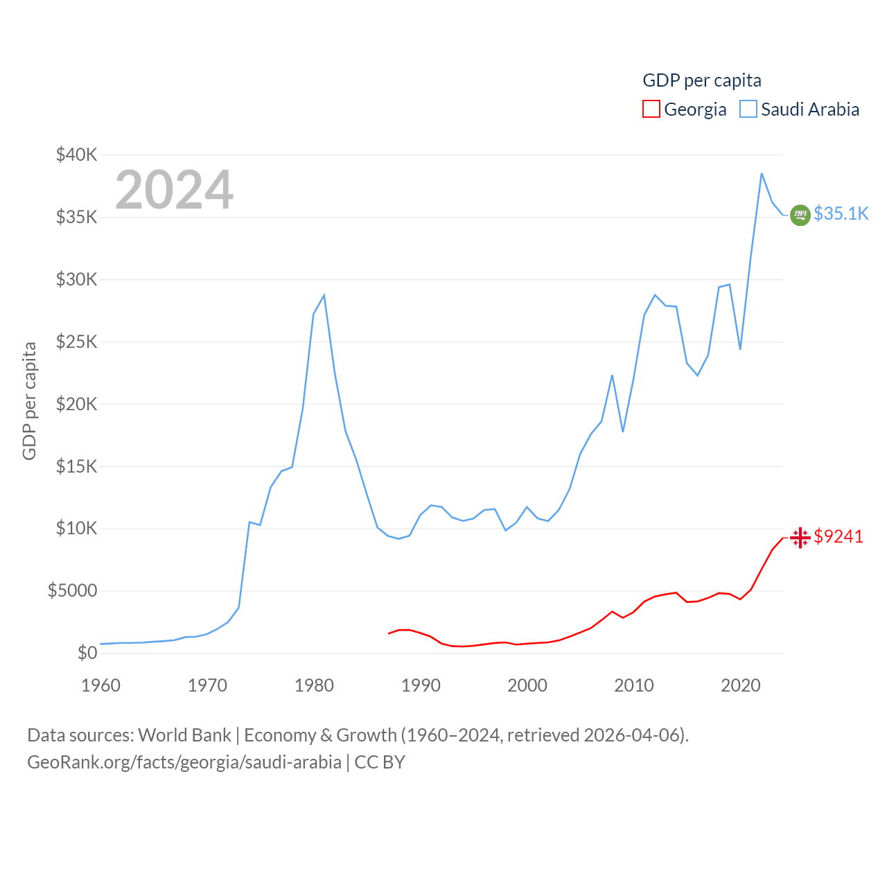 By GDP, Georgia ranks 107/197 ($34.2B) and Saudi Arabia ranks 18/197 ($1.24T). By GDP per capita, Georgia ranks 89/197 ($9,241), while Saudi Arabia ranks 33/197 ($35,122).