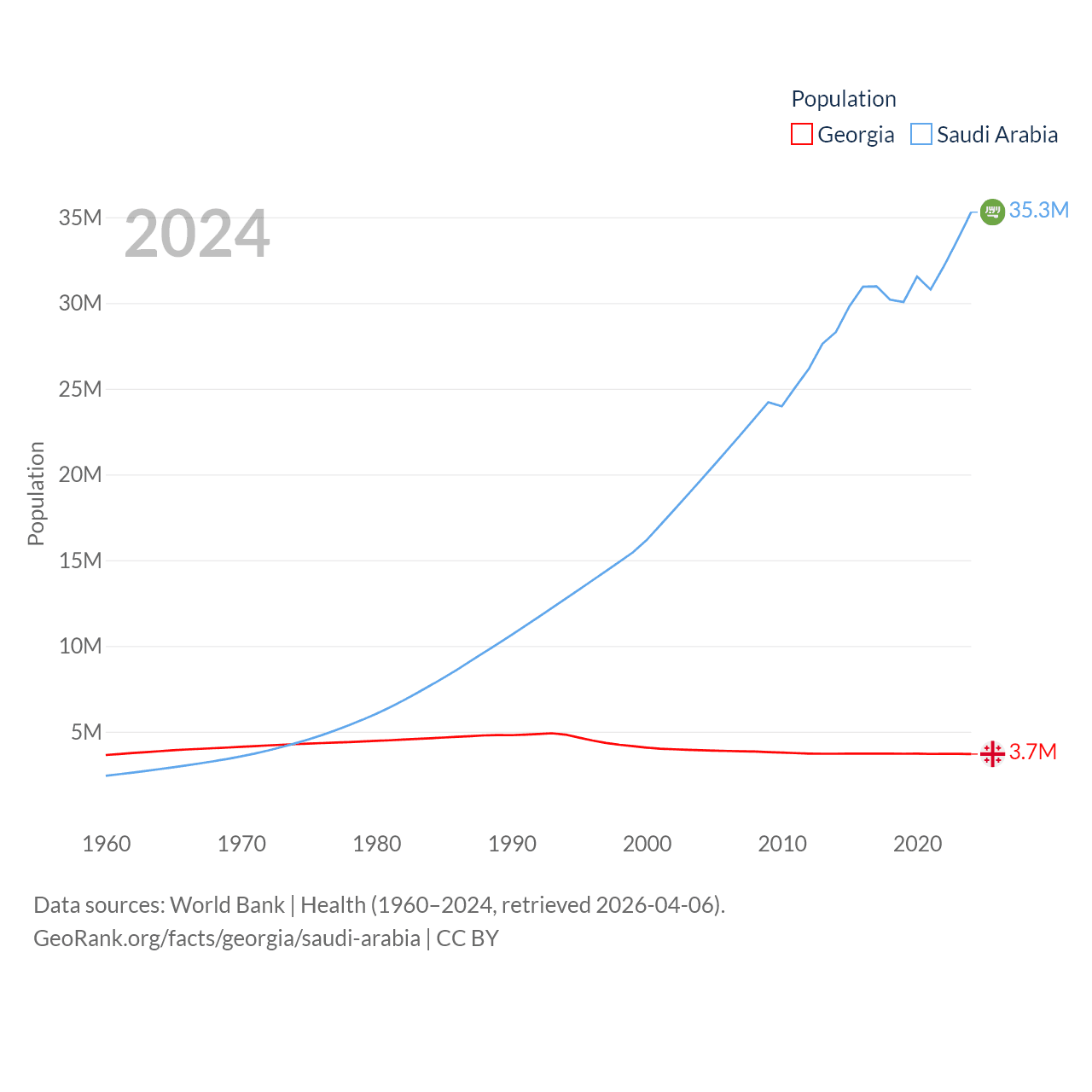 Georgia has a population of 3.7M (ranked 130/197), compared with 35.3M in Saudi Arabia (ranked 45/197). Georgia's land area is 26,830 sq mi versus 830,000 sq mi for Saudi Arabia (ranked 118th vs. 12th).