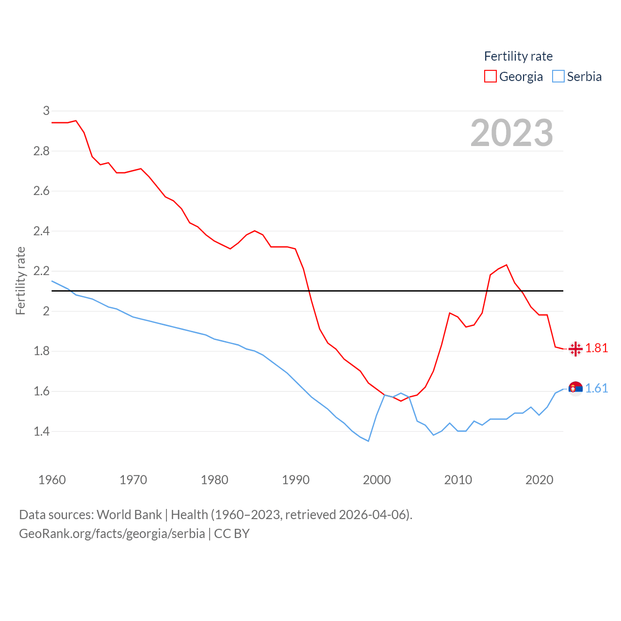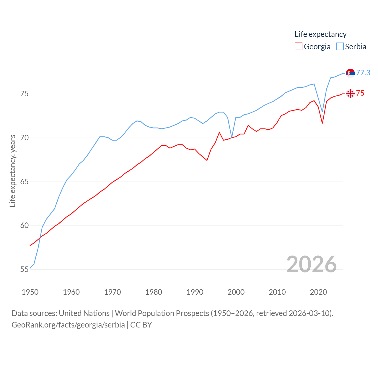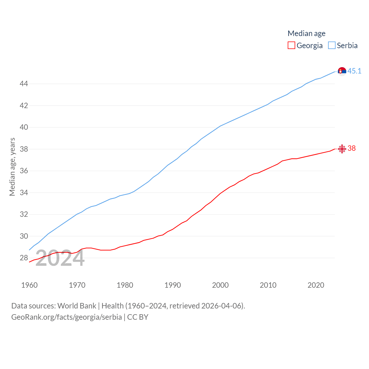 Georgia has a population of 3.7M (ranked 130/197), compared with 6.59M in Serbia (ranked 109/197). Georgia's land area is 26,830 sq mi versus 32,467 sq mi for Serbia (ranked 118th vs. 111th).