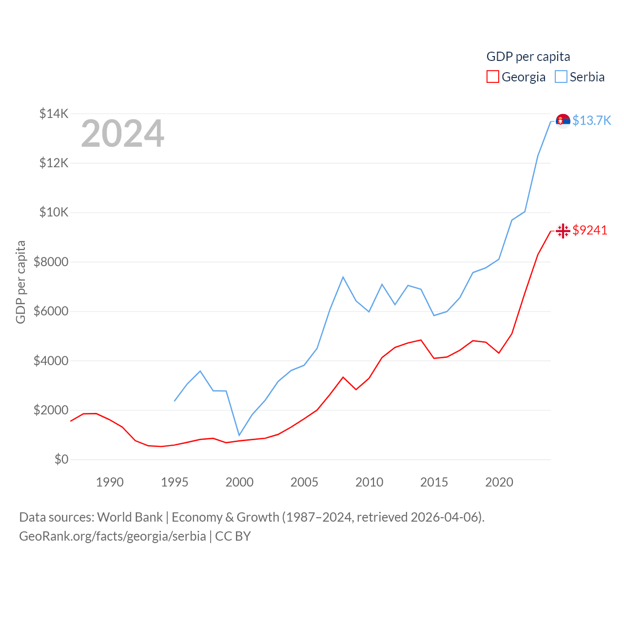 By GDP, Georgia ranks 107/197 ($34.2B) and Serbia ranks 76/197 ($90.1B). By GDP per capita, Georgia ranks 89/197 ($9,241), while Serbia ranks 73/197 ($13,679).