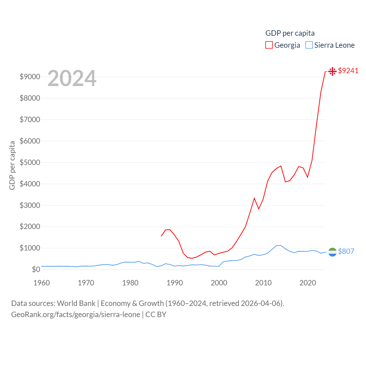 By GDP, Georgia ranks 107/197 ($34.2B) and Sierra Leone ranks 160/197 ($6.97B). By GDP per capita, Georgia ranks 89/197 ($9,241), while Sierra Leone ranks 186/197 ($807).