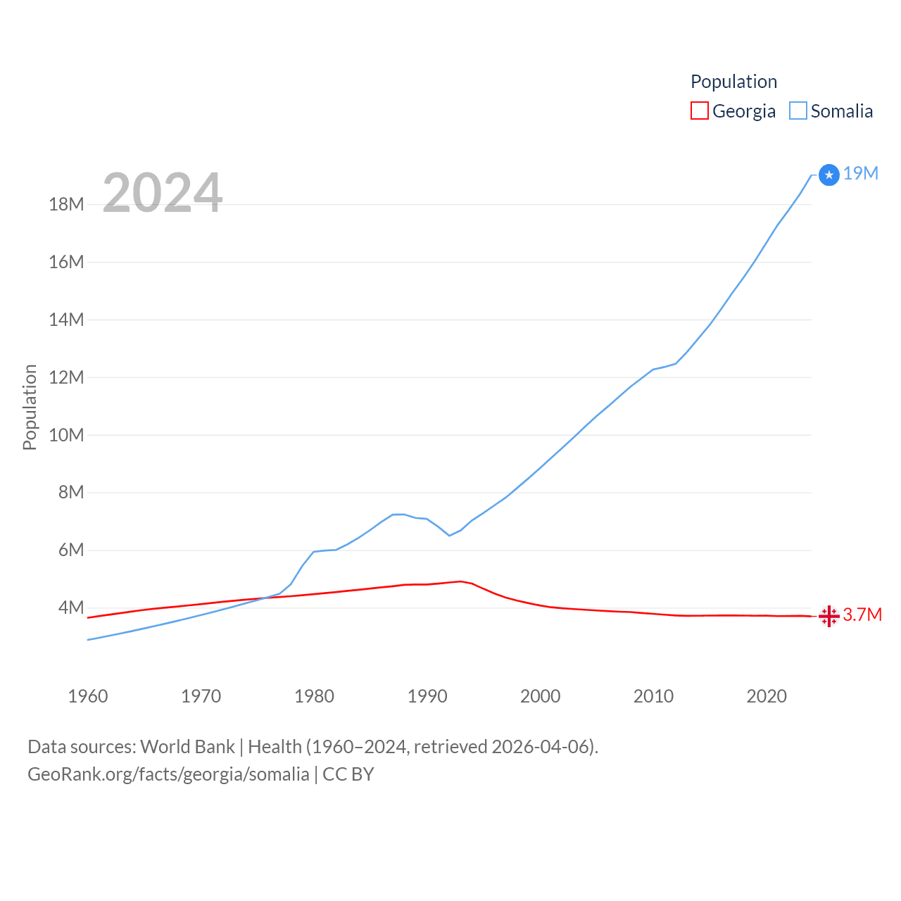 Georgia has a population of 3.7M (ranked 130/197), compared with 19M in Somalia (ranked 68/197). Georgia's land area is 26,830 sq mi versus 242,217 sq mi for Somalia (ranked 118th vs. 42nd).