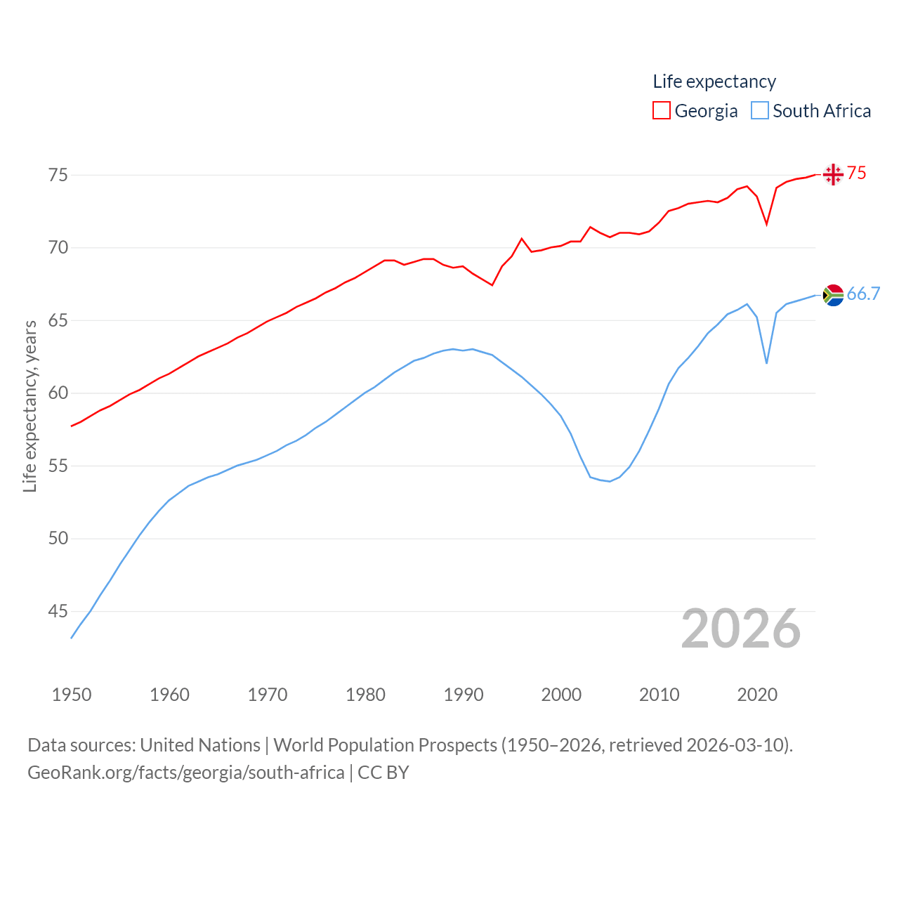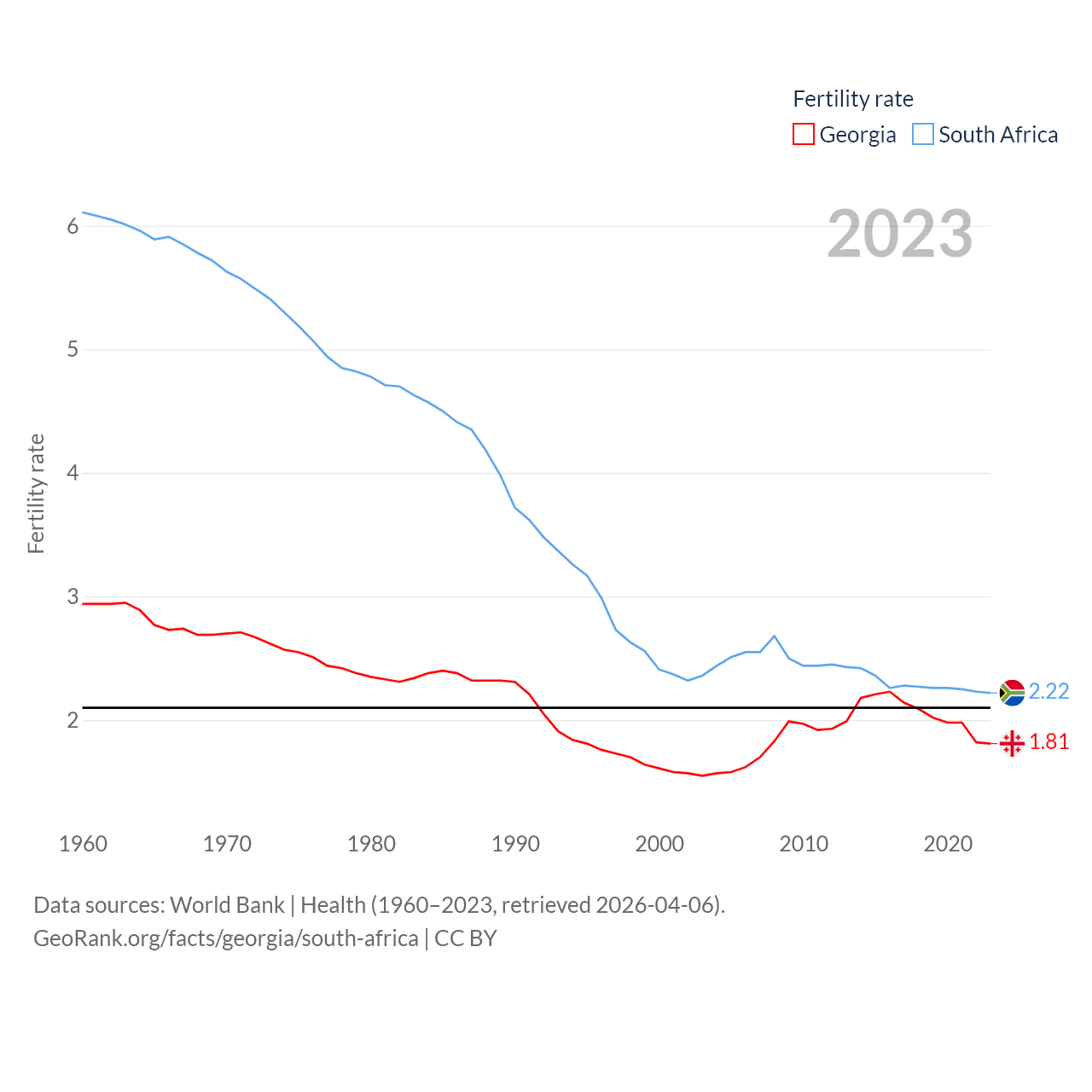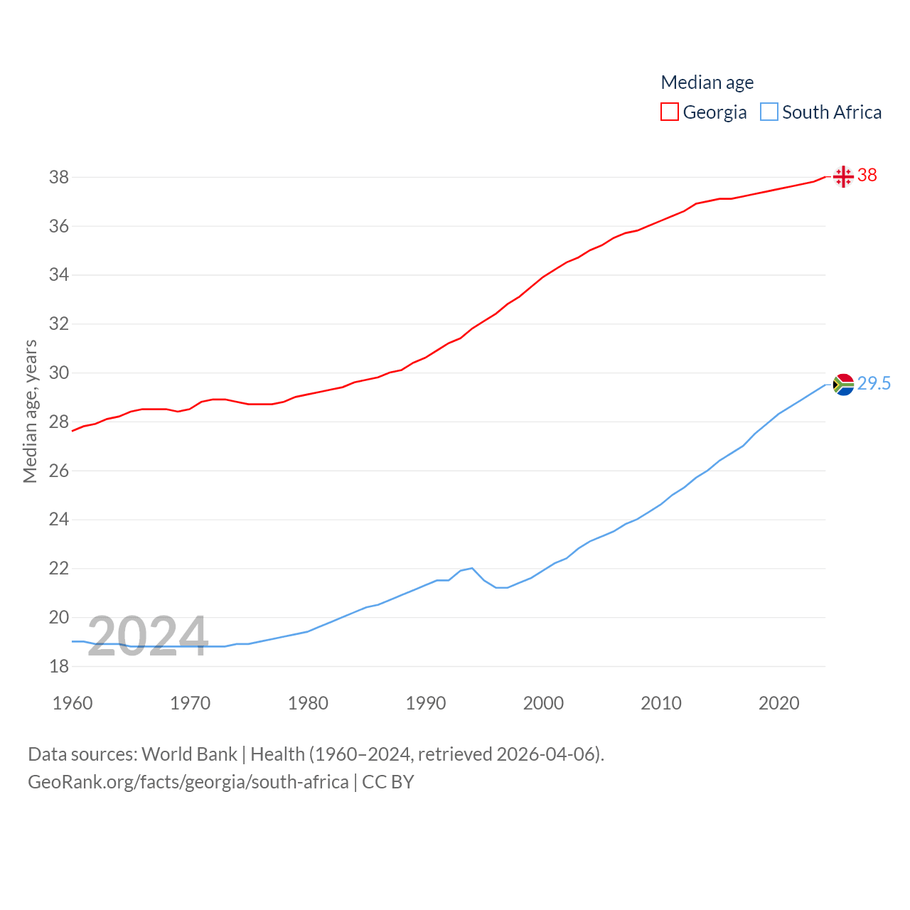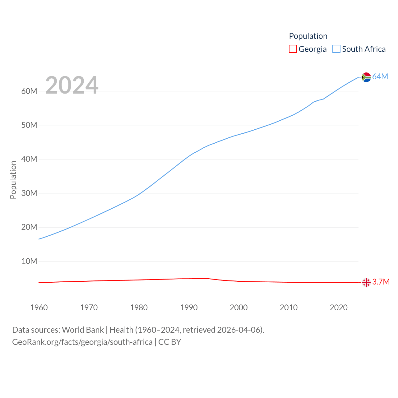 Georgia has a population of 3.7M (ranked 130/197), compared with 64M in South Africa (ranked 24/197). Georgia's land area is 26,830 sq mi versus 468,377 sq mi for South Africa (ranked 118th vs. 24th).